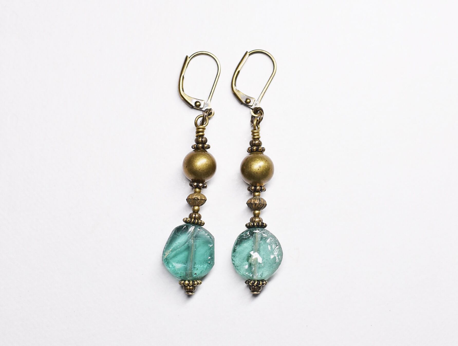 ローマングラスと、ビンテージのブラスを繋いだピアスです。