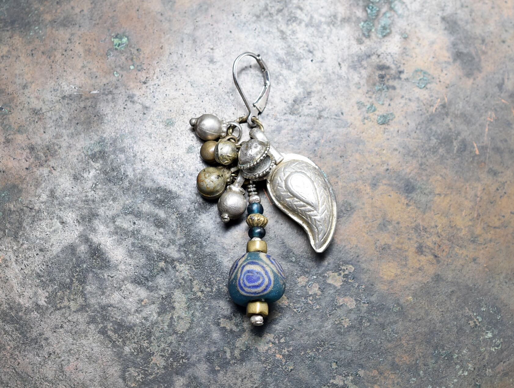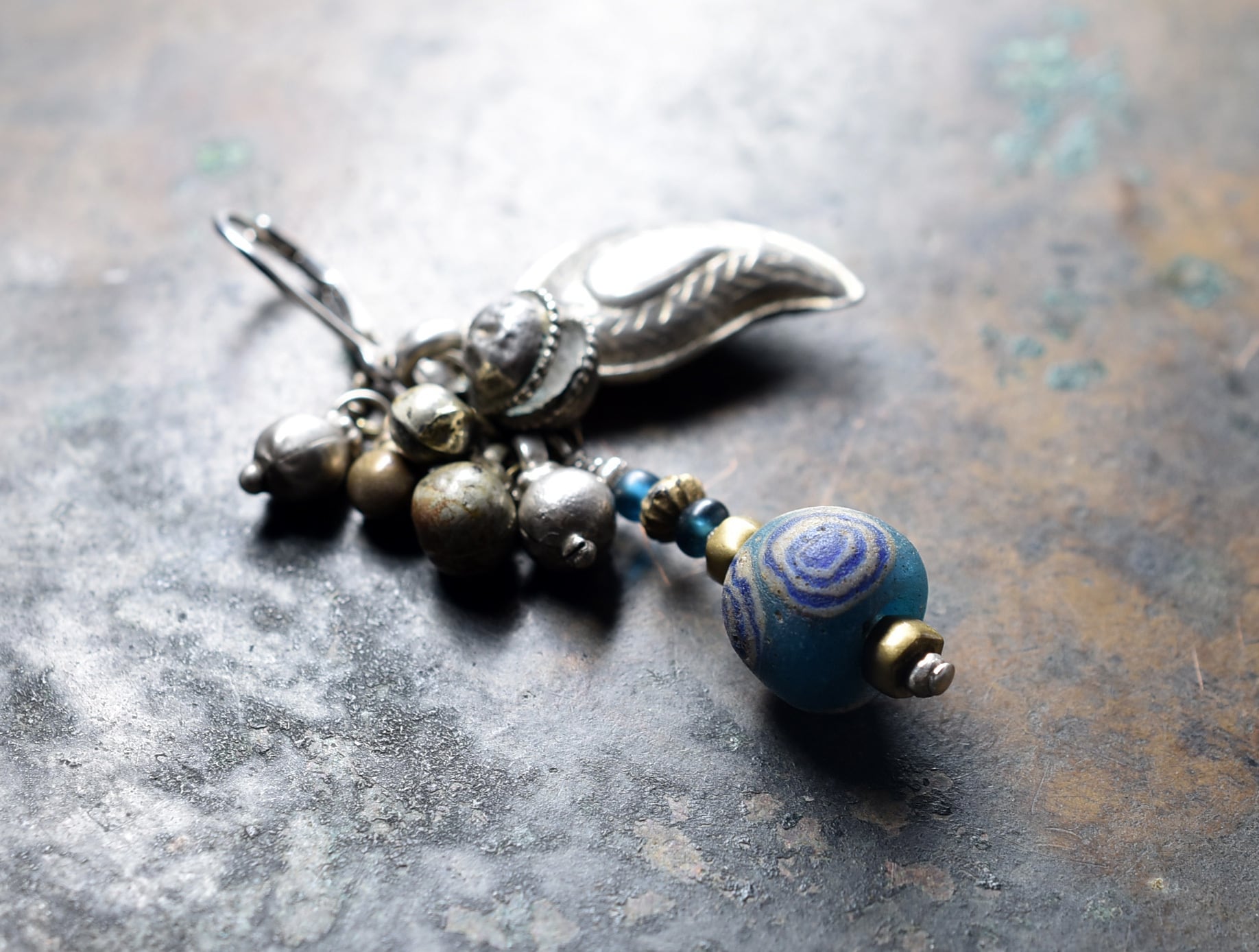 中世重多眼ブルーアイビーズとたわわな鈴、アフガンoldシルバーの片耳ピアス