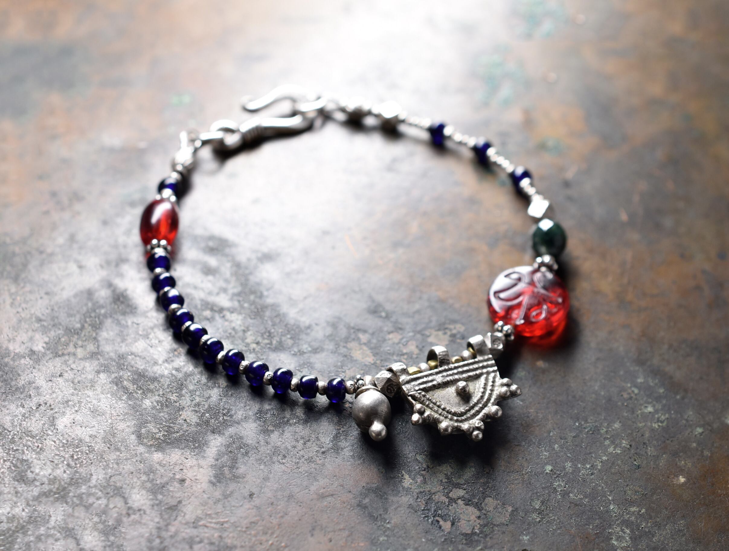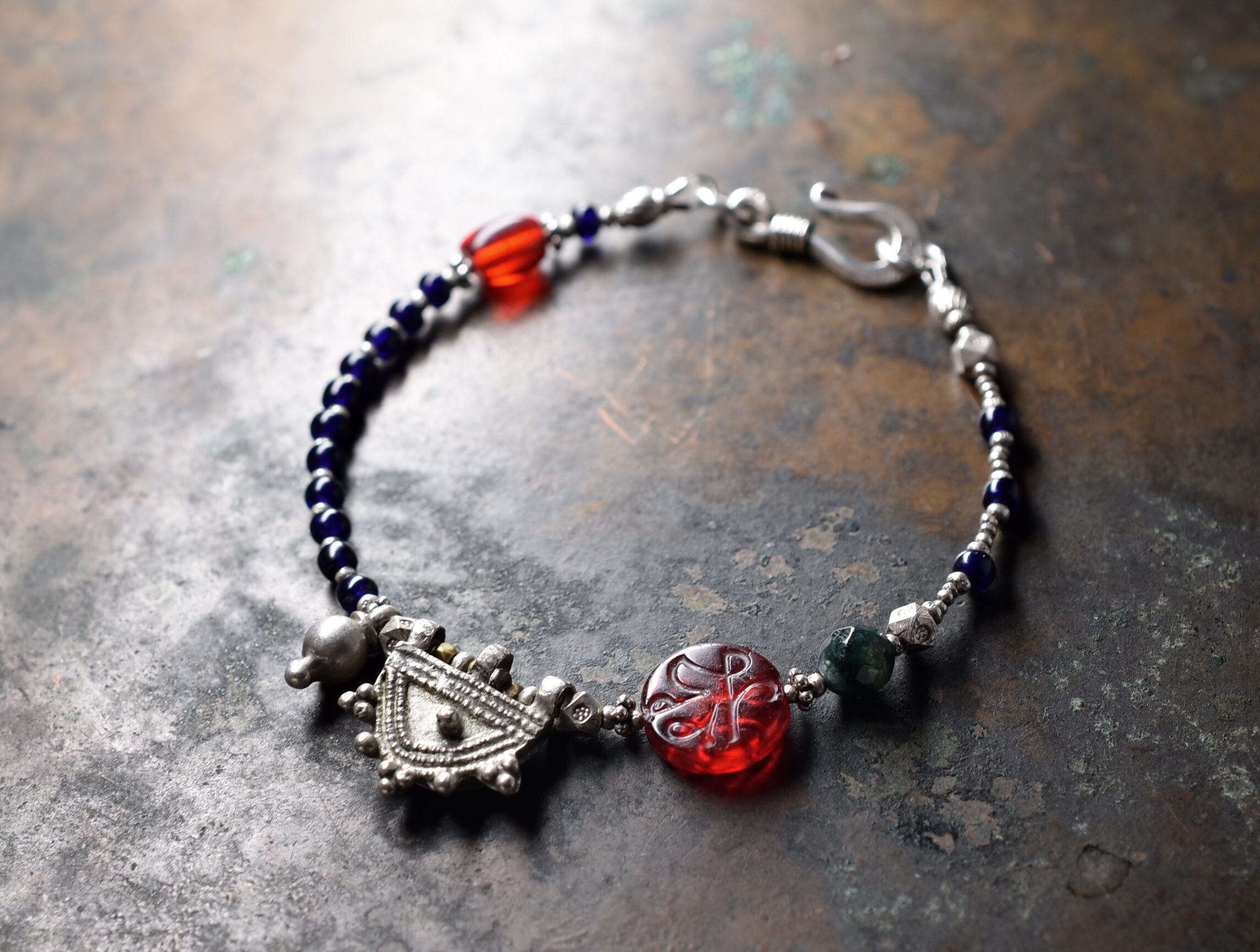 エチオピアンパーツと、聖者のビーズ、瑠璃色のアンティークビーズやカレンシルバーなどを繋いだブレスです。