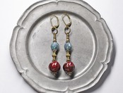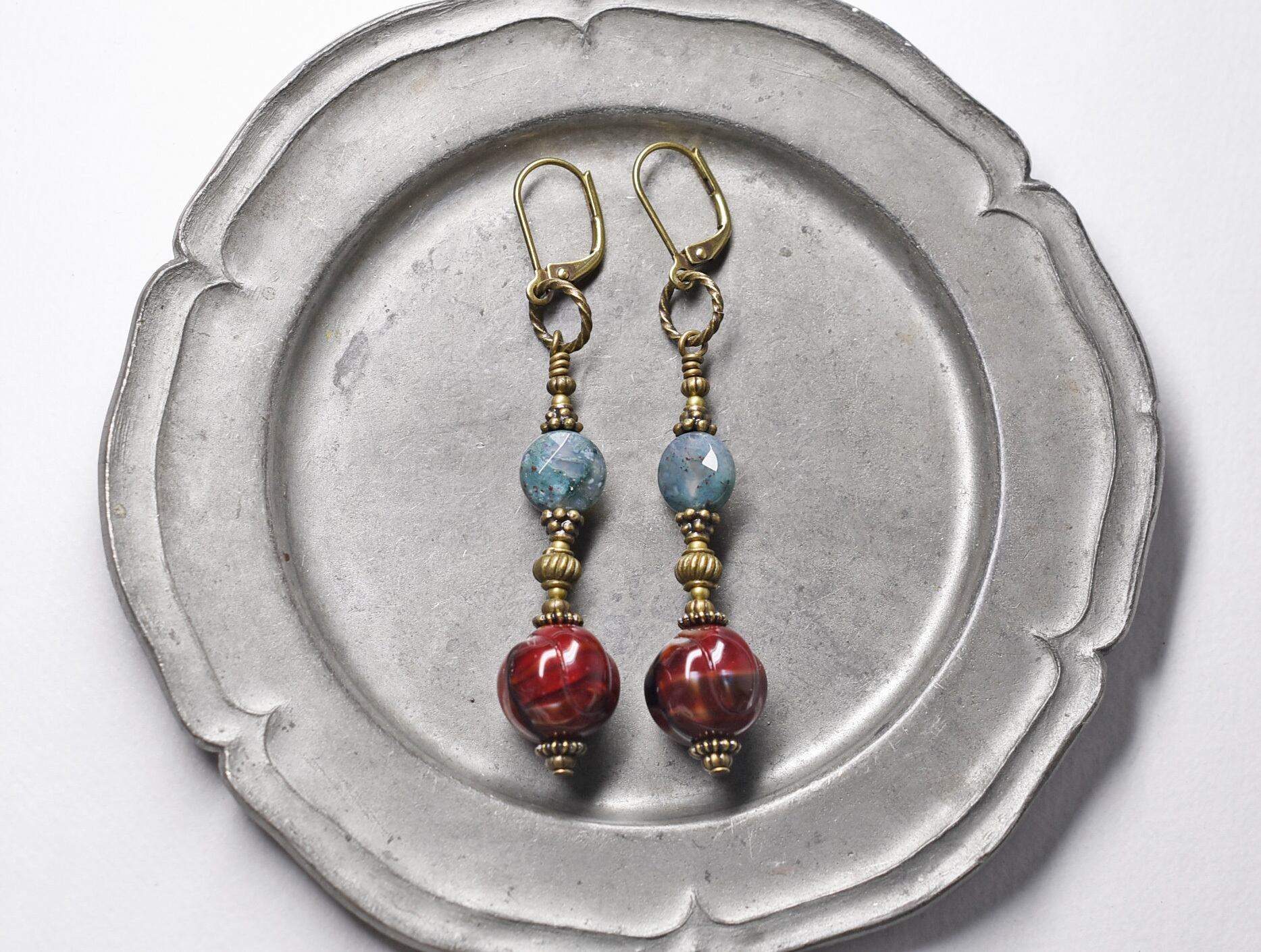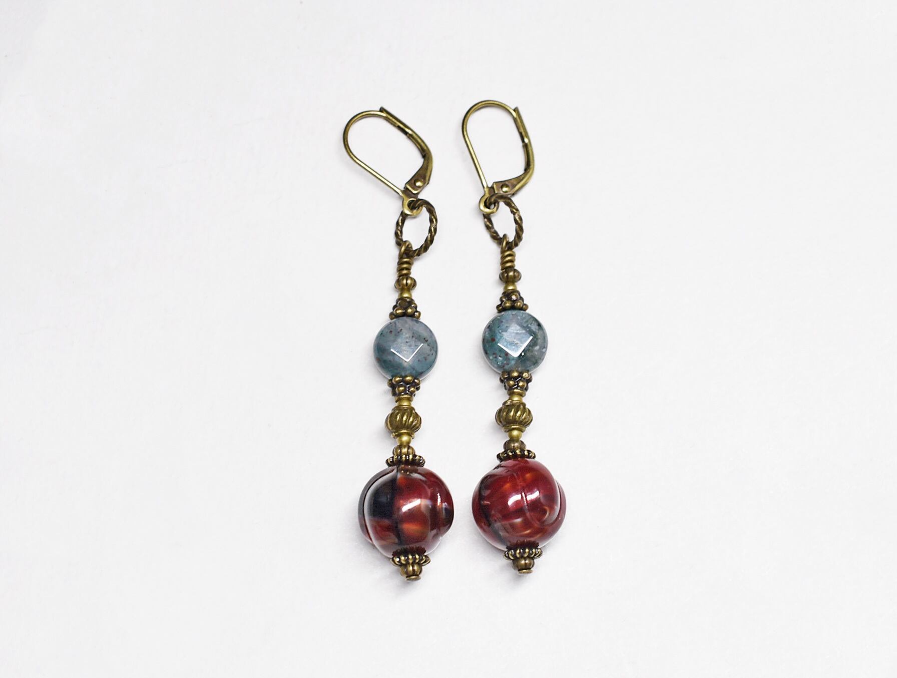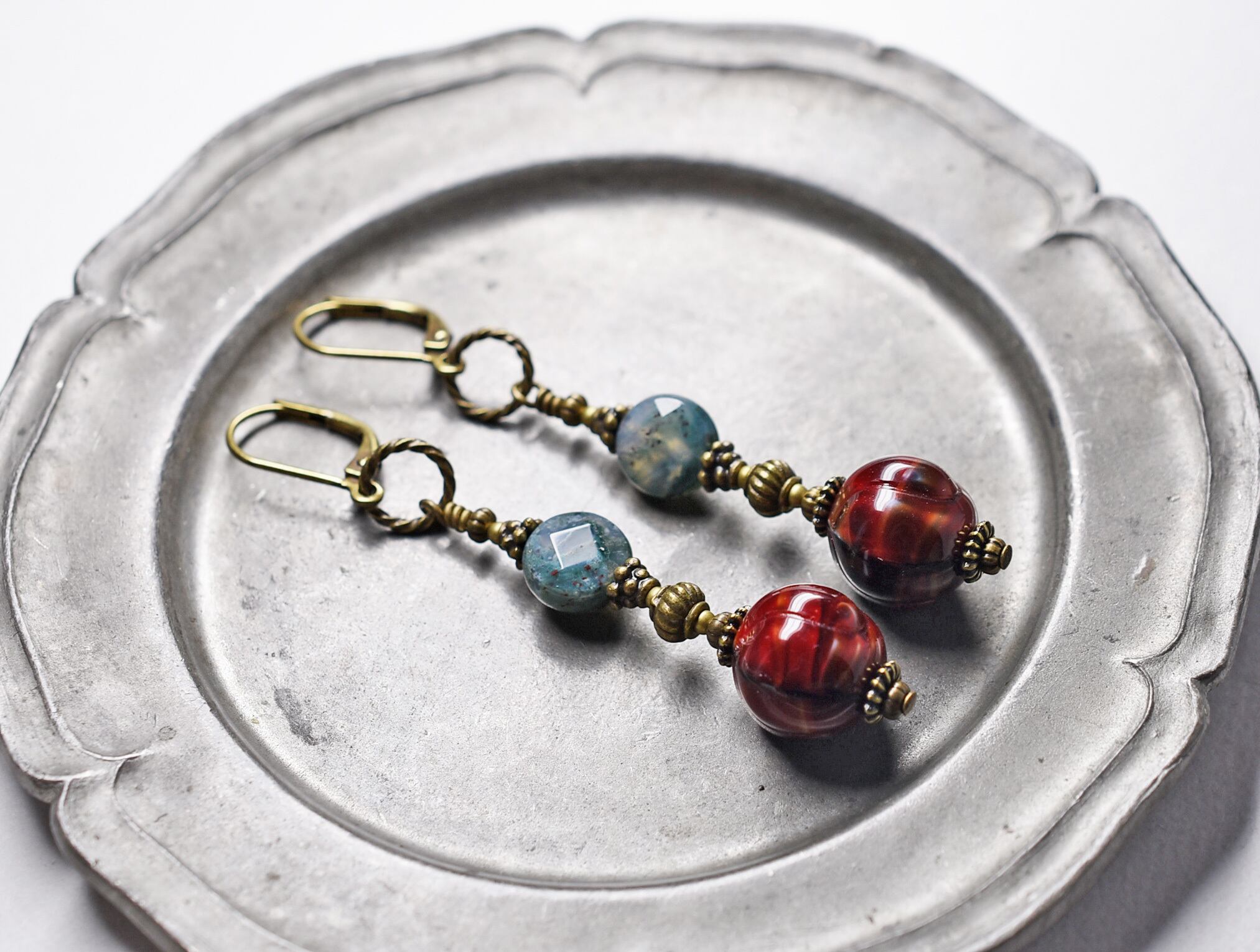 ダークレッドマーブルドイツヴィンテージビーズとインディアンアゲートのピアス