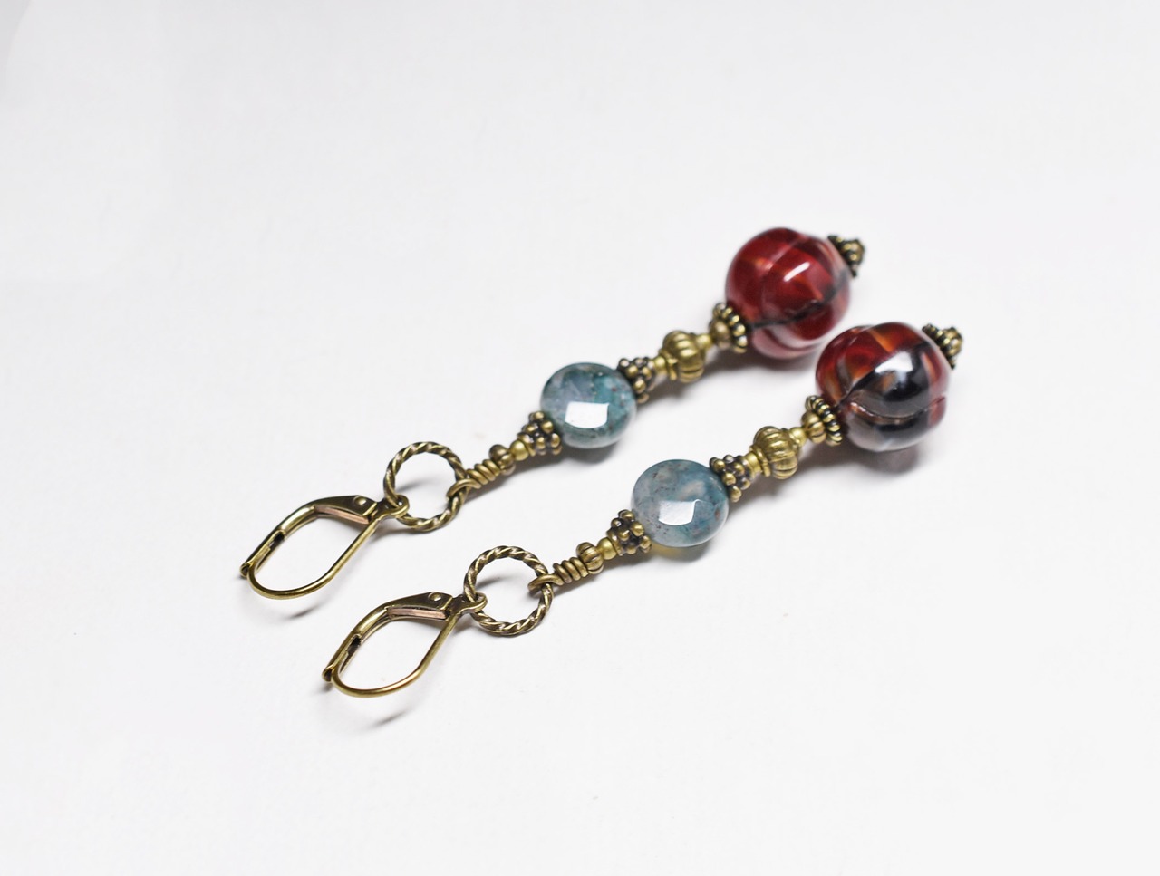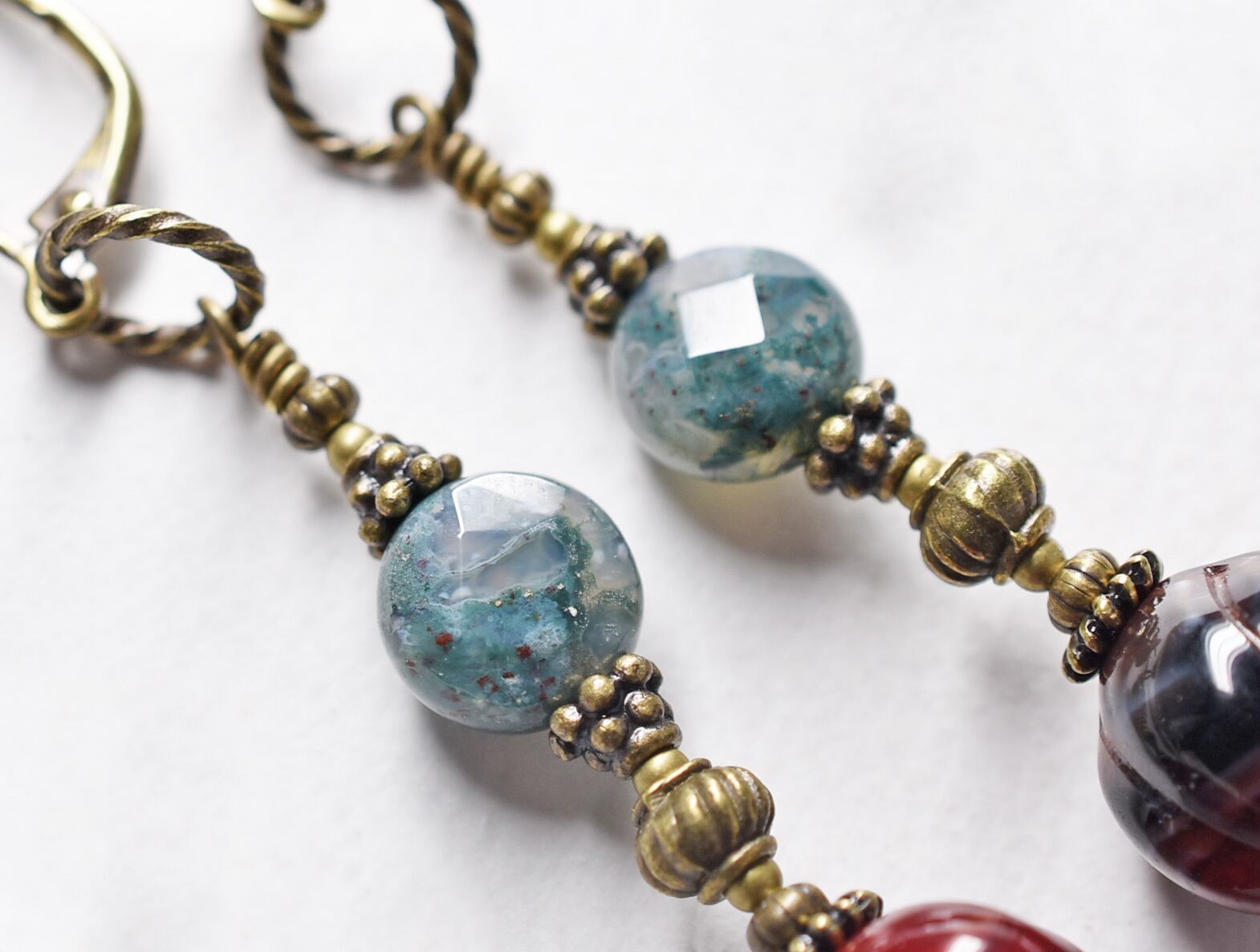 ドイツのヴィンテージビーズと、インディアンアゲート、ブラスビーズを繋げたピアスです。
