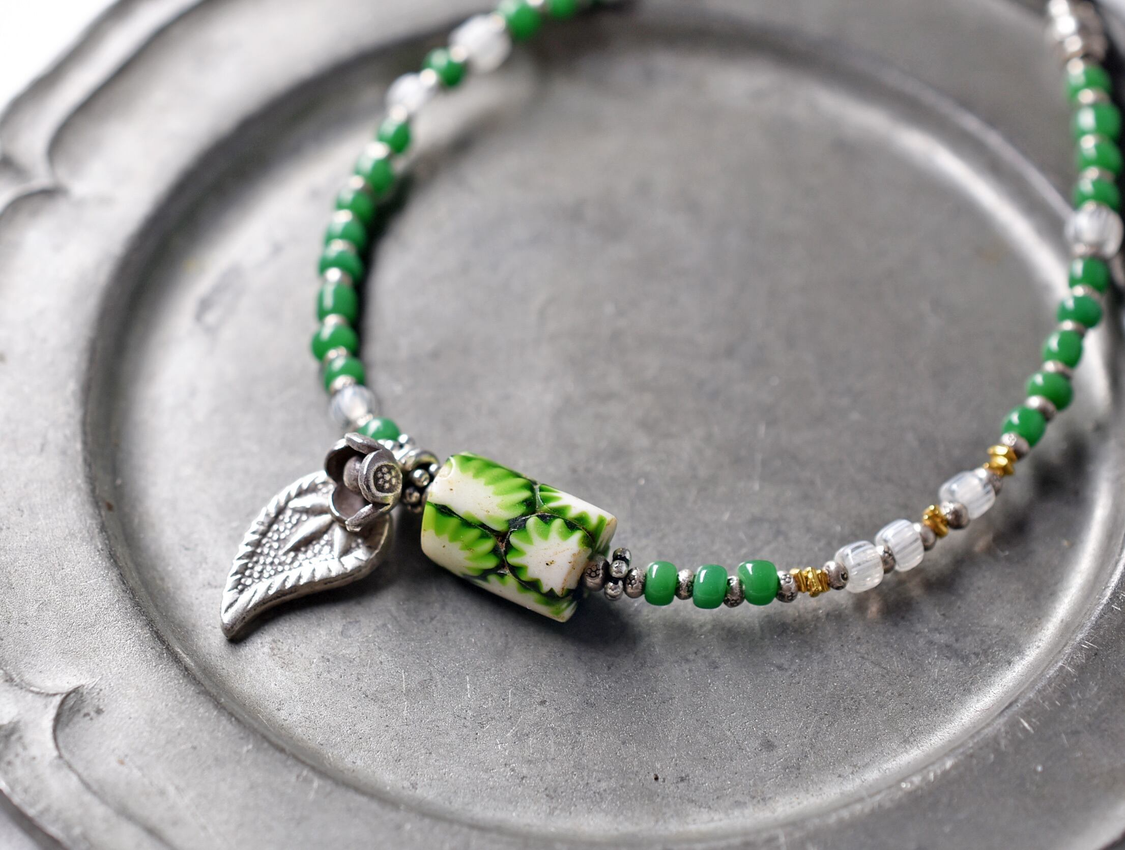 小さなグリーンもミルフィオリと同じベネチア産のアンティークビーズです。