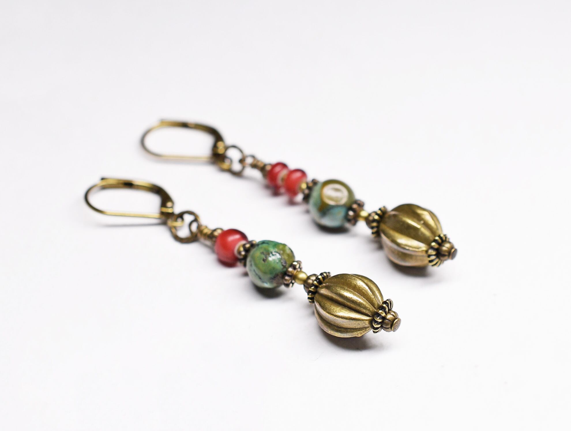 古いブラスビーズと、ターコイズ、金赤ホワイトハーツを繋いだピアスです。