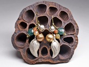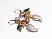 ペイズリーのようなパーツと3種類の天然石、2種類の鈴を繋いだピアスです。