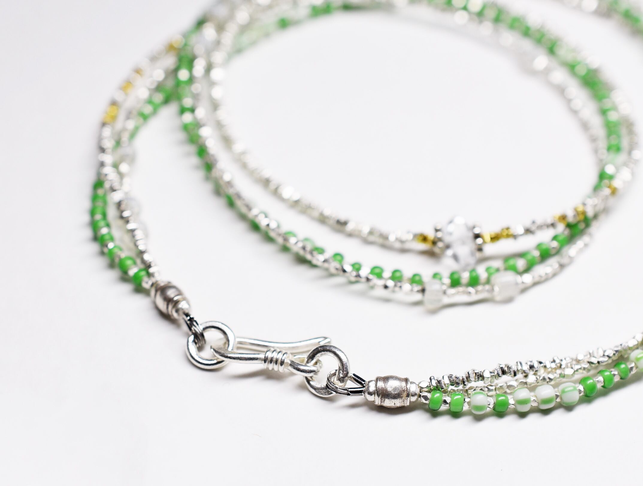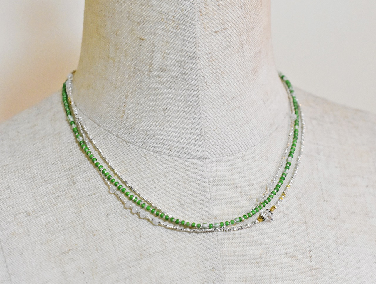 カレンシルバーと一粒ハーキマーダイヤモンド、ヴィンテージ&アンティークビーズのかすみ草3連ネックレス