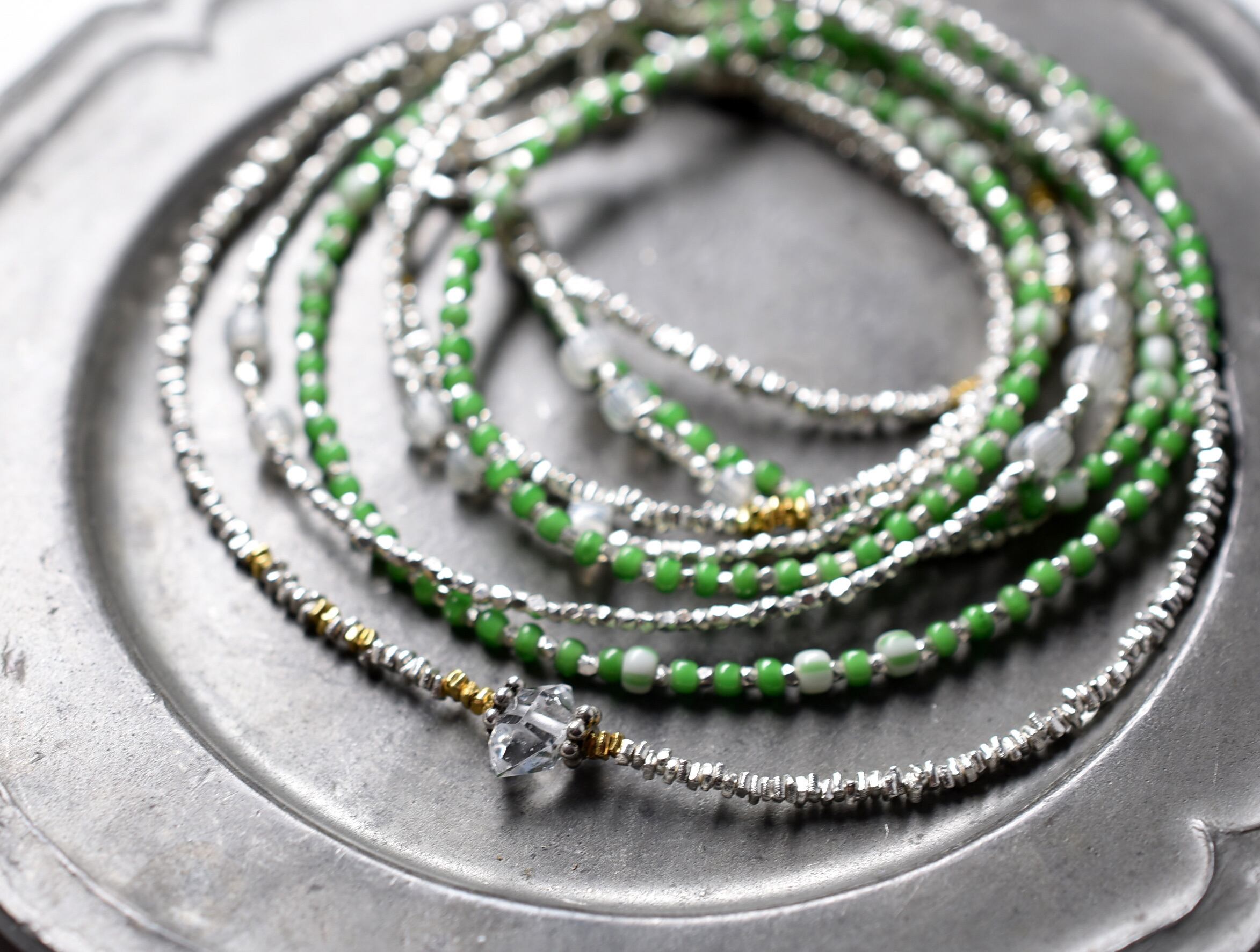 小さなカレンシルバービーズ、ヴィンテージ&アンティークビーズ、一粒ハーキマーダイヤモンドを繋げた3連のネックレスです。