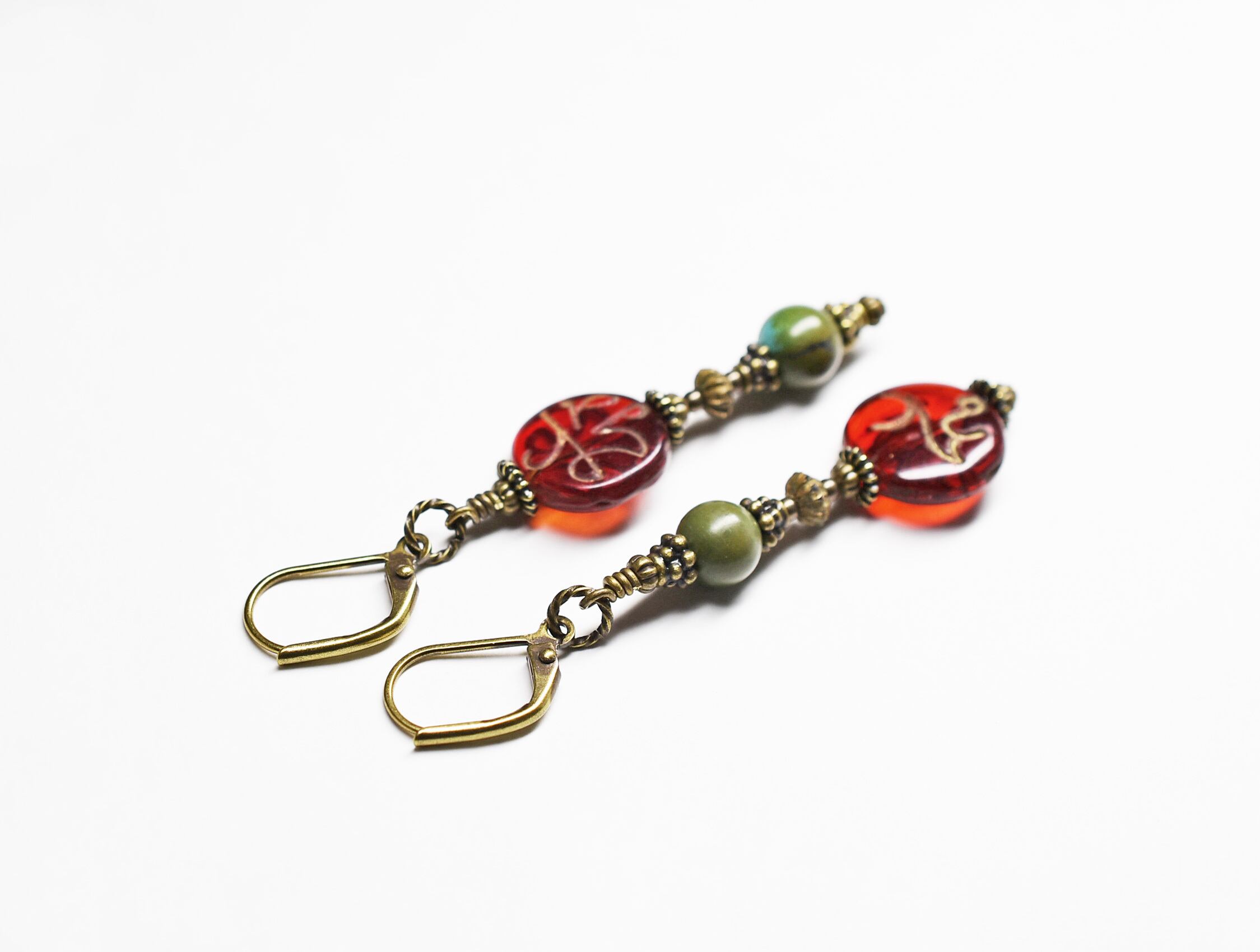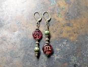 アラビア文字が施された聖者のビーズと、ターコイズ、ブラスビーズを繋いだピアスです。