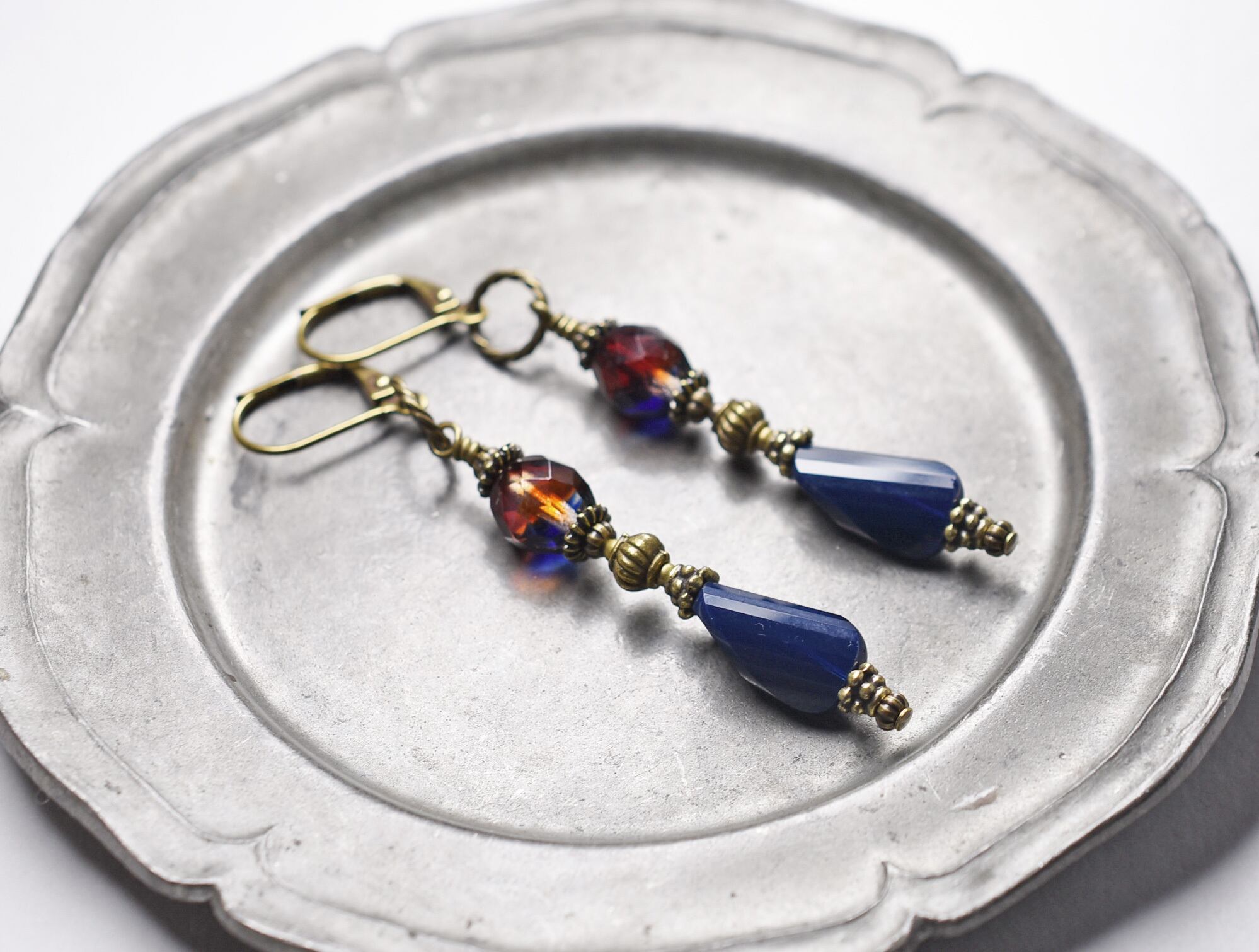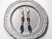 紺色のソレイユガラスビーズと、多面体のチェコビーズ、ブラスビーズを繋いだピアスです。