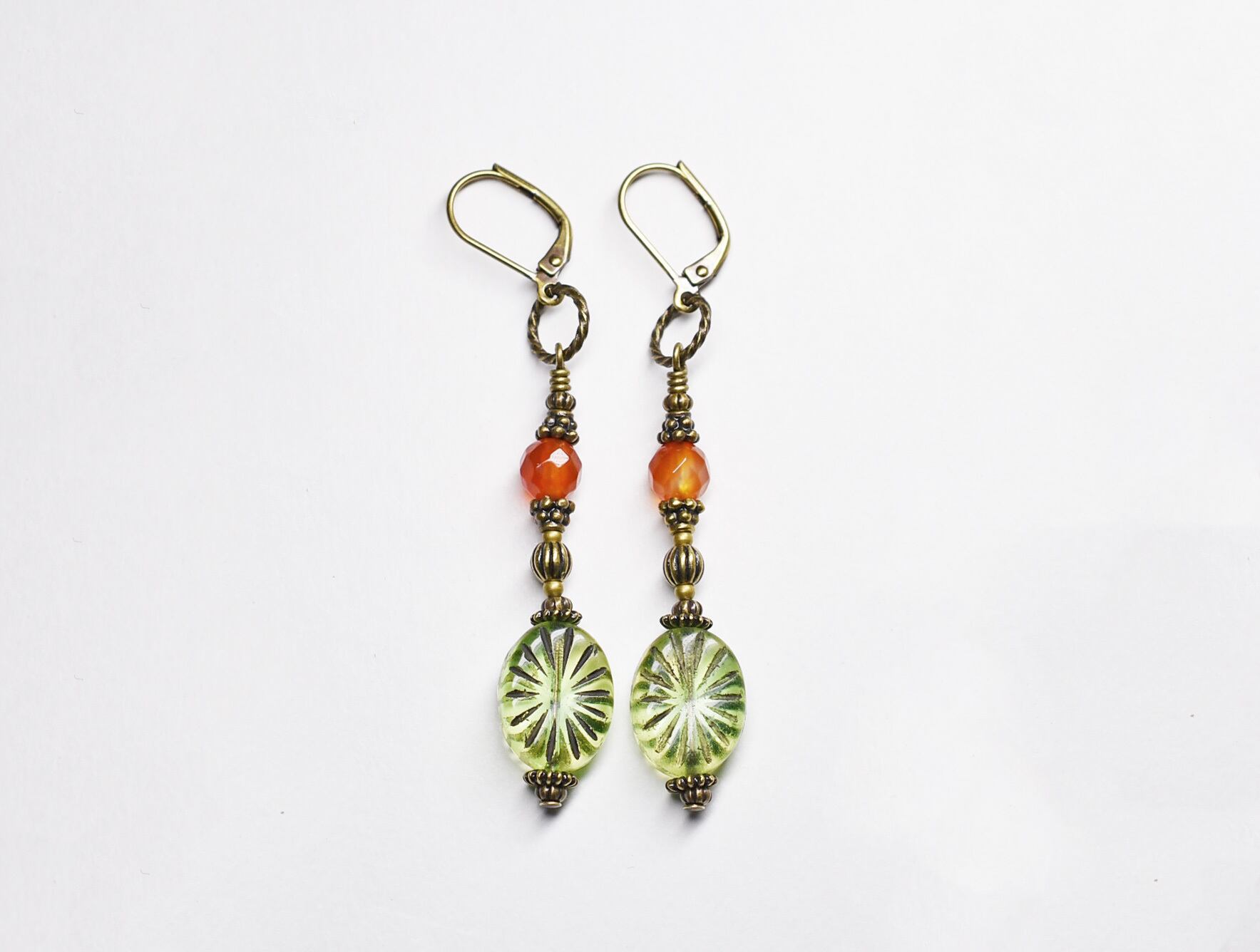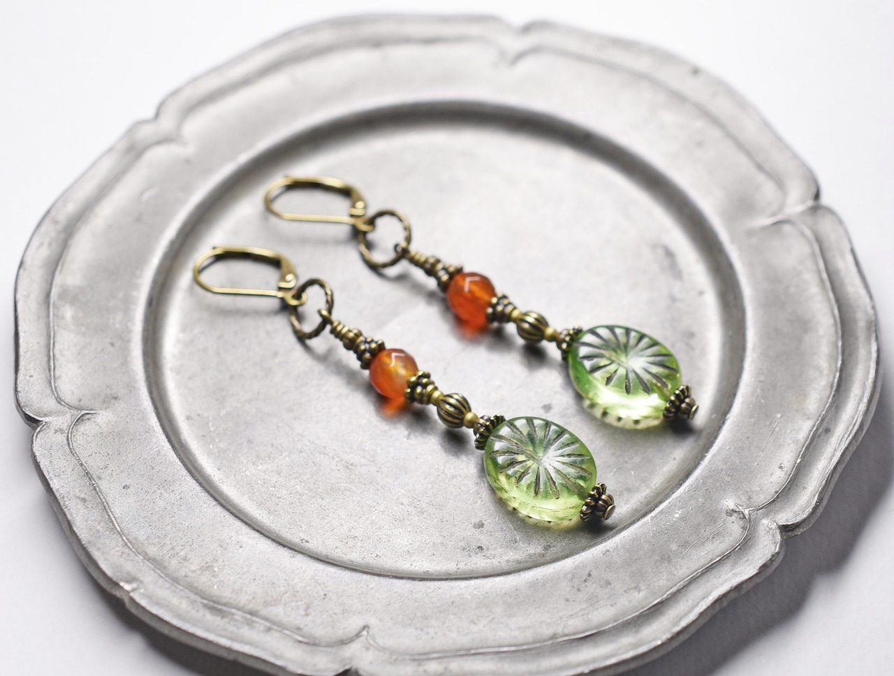 ウランガラスと、カーネリアン、ブラスビーズを繋いだピアスです。
