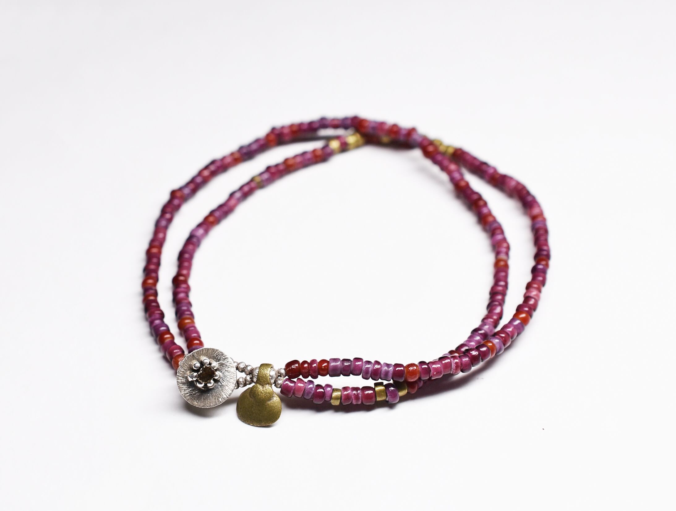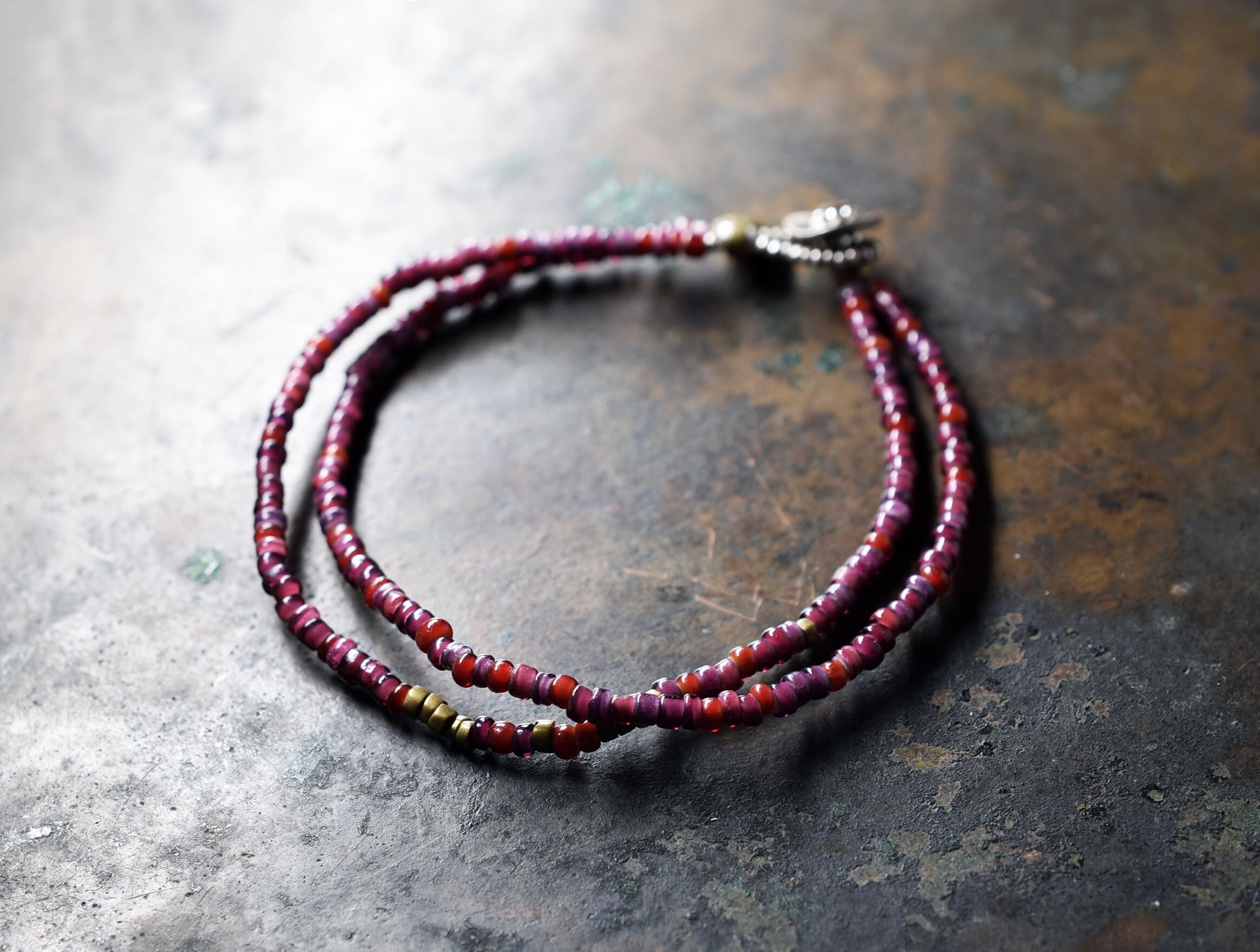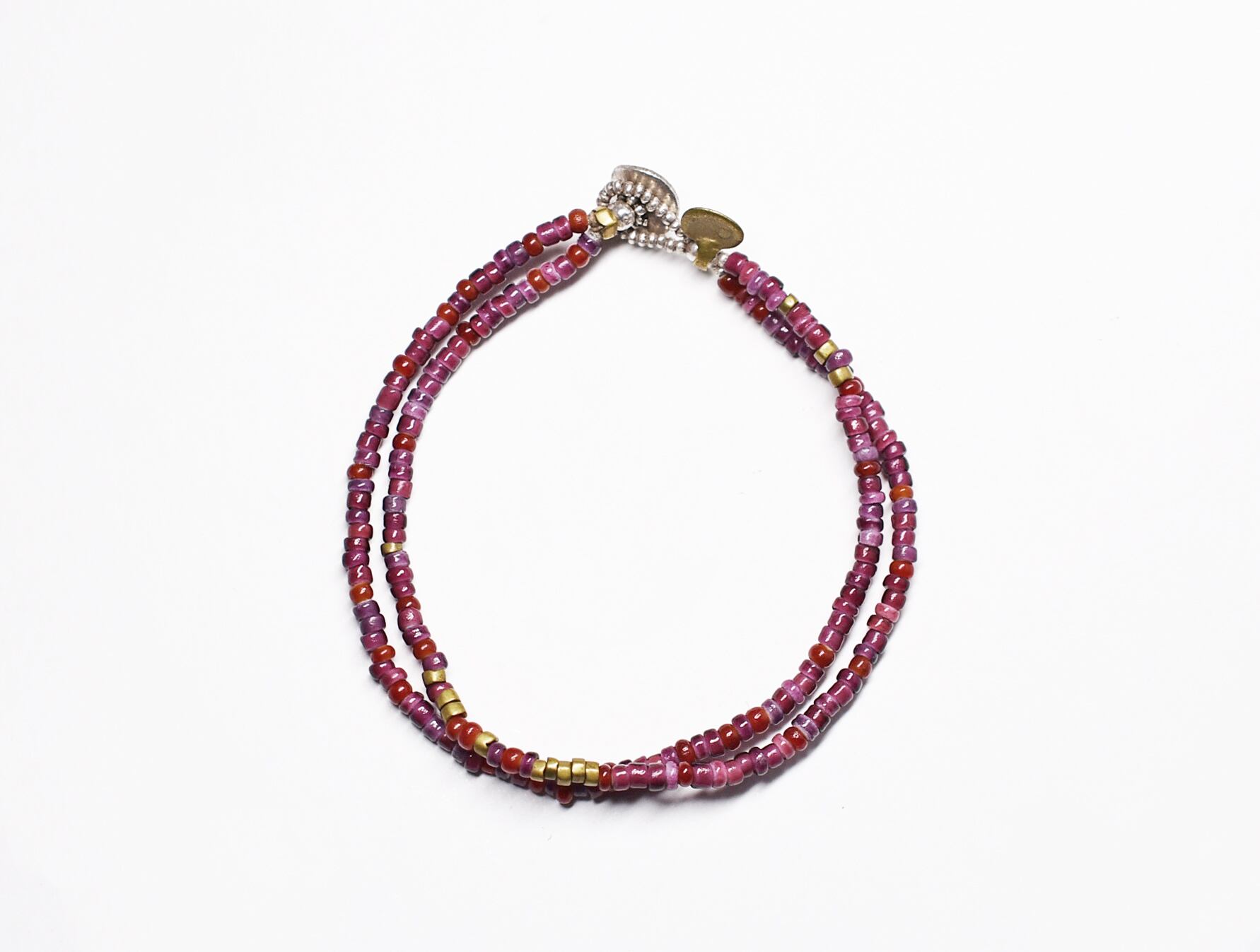 濃淡のある紫色や赤色のビーズはホワイトハーツと呼ばれるアンティークビーズです。