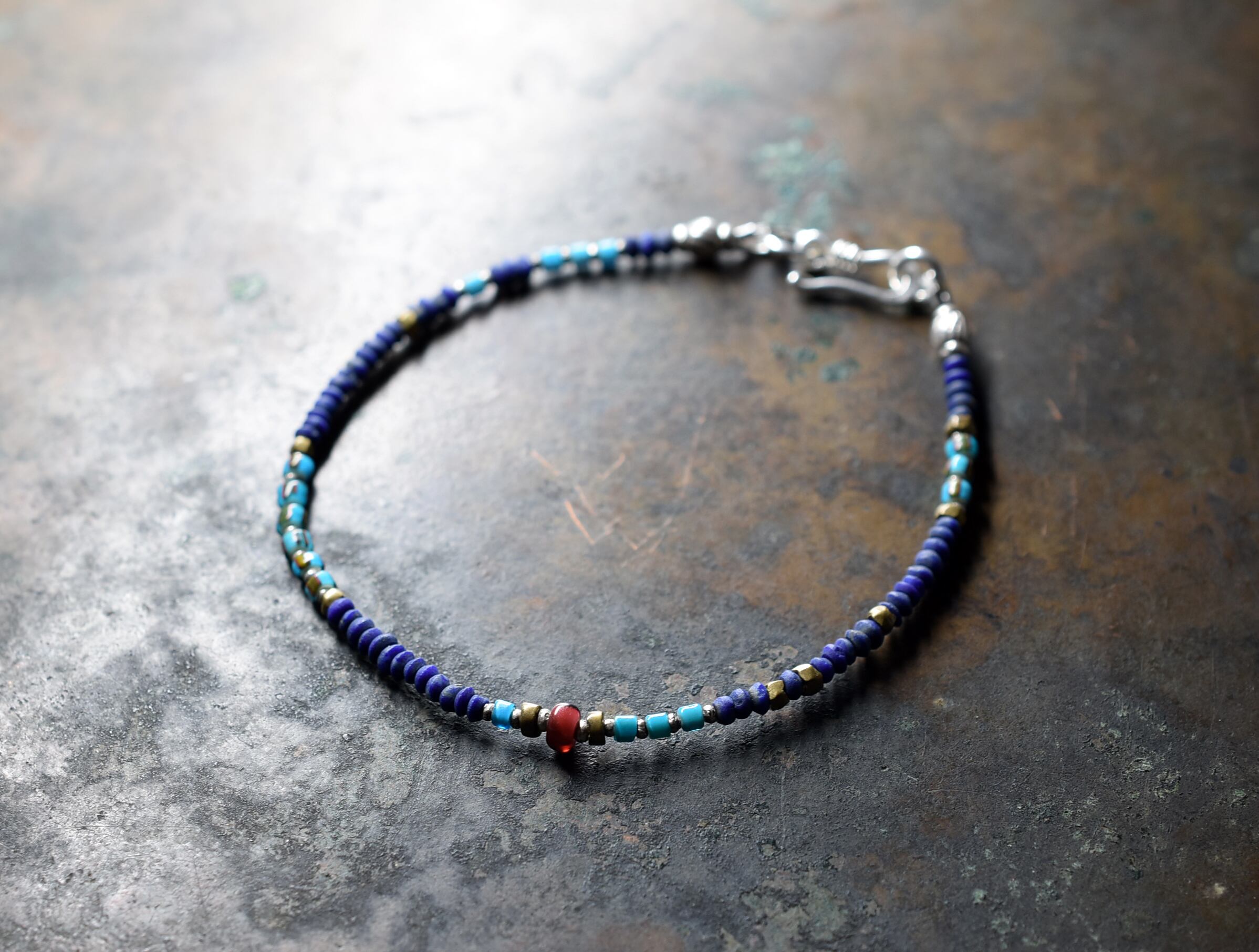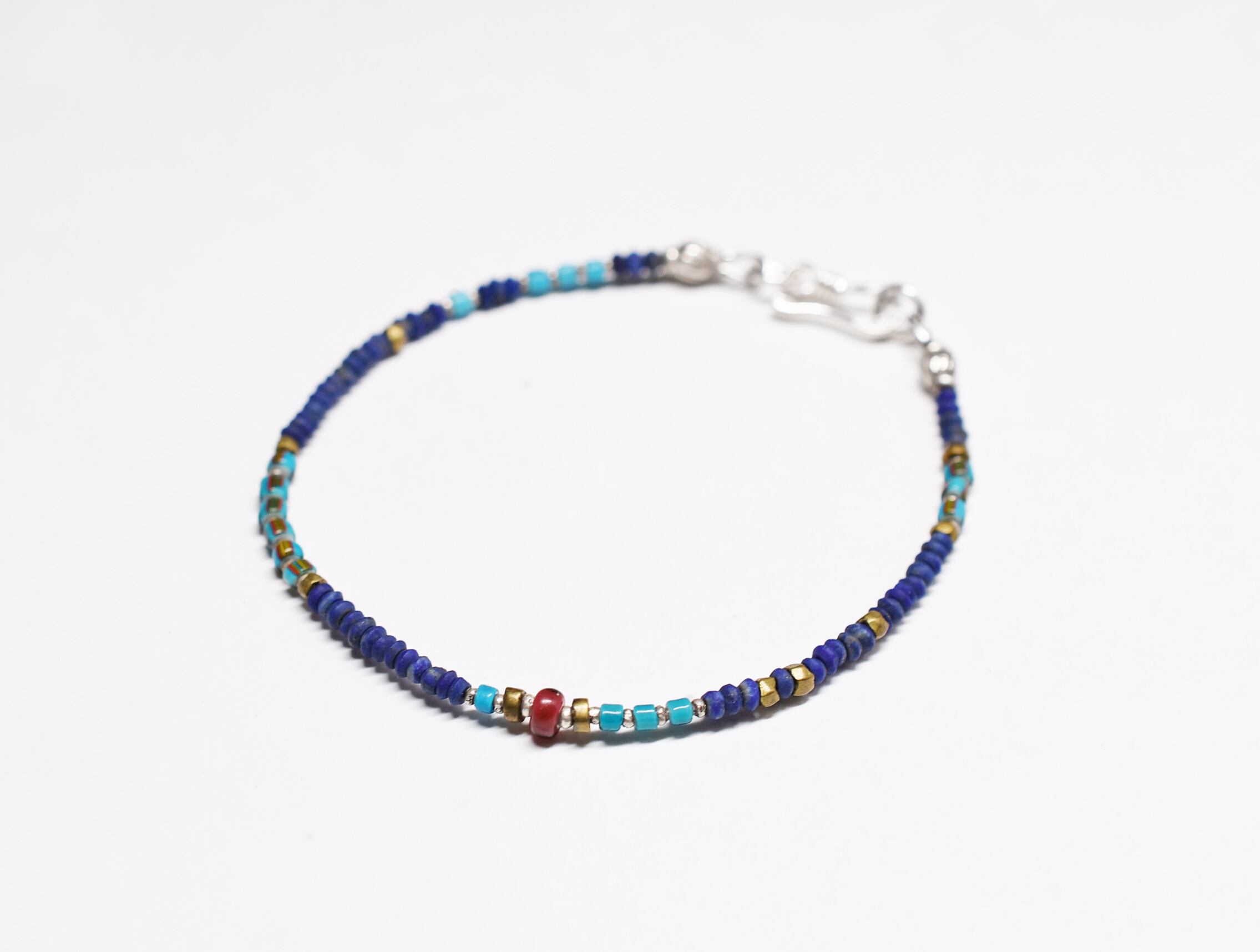 算盤型ラピスととターコイズブルー&金赤ホワイトハーツ、oldオリッサブラスの華奢なブレス
