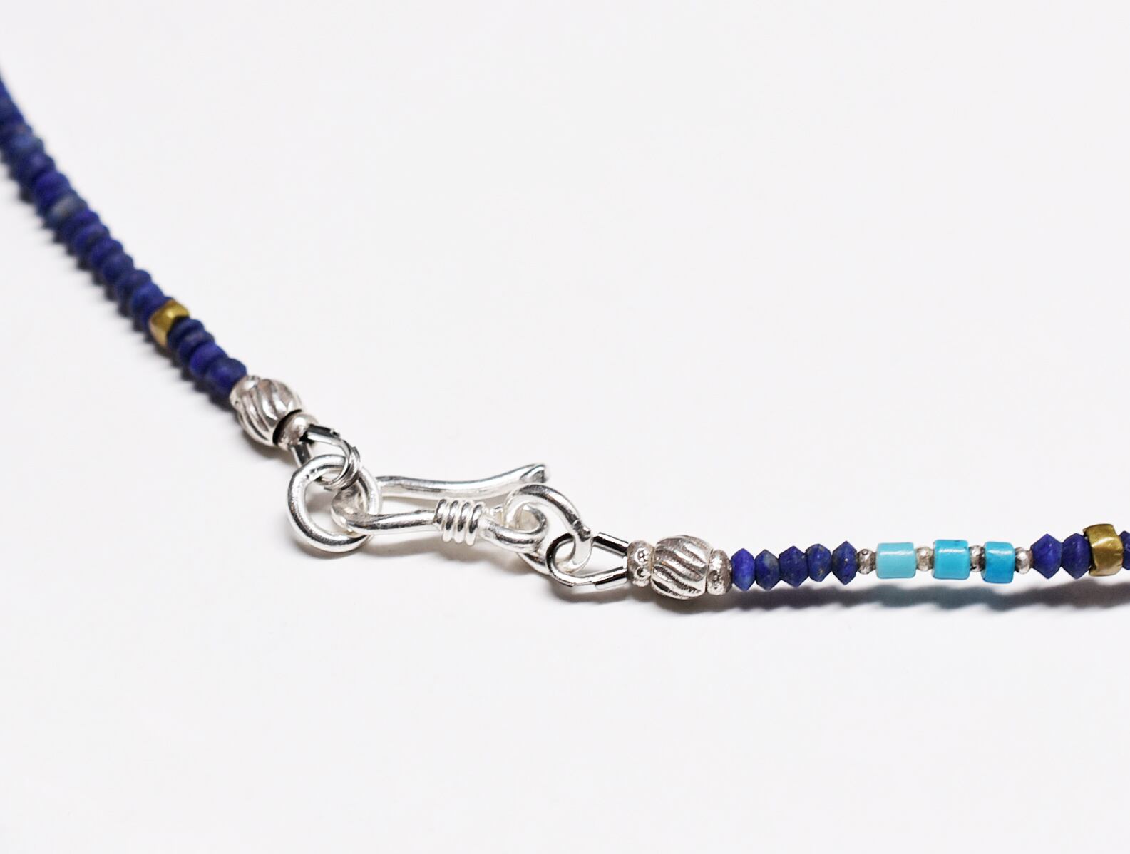 小さなラピスラズリと、3種類のホワイトハーツ、oldオリッサブラスなどを繋げたネックレスです。