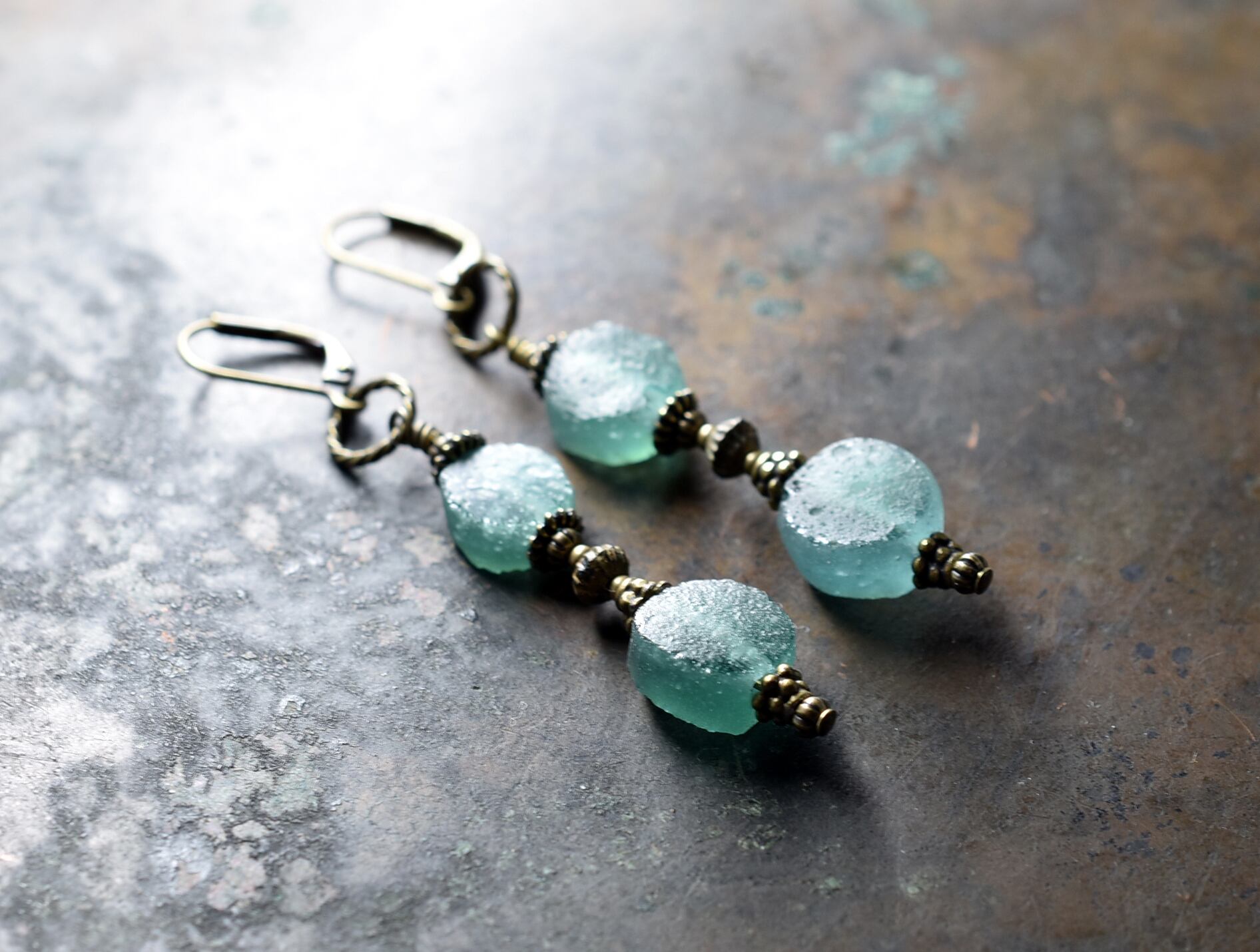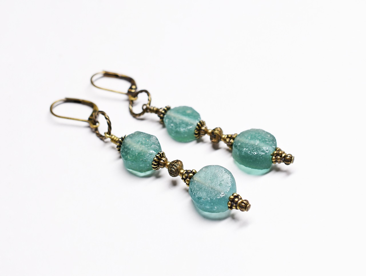 2粒ミントグリーンローマングラスとブラスビーズのピアス