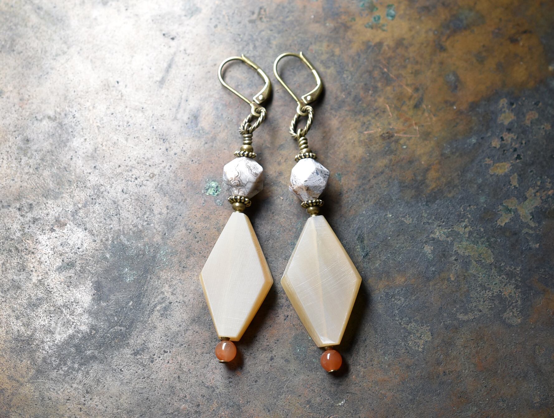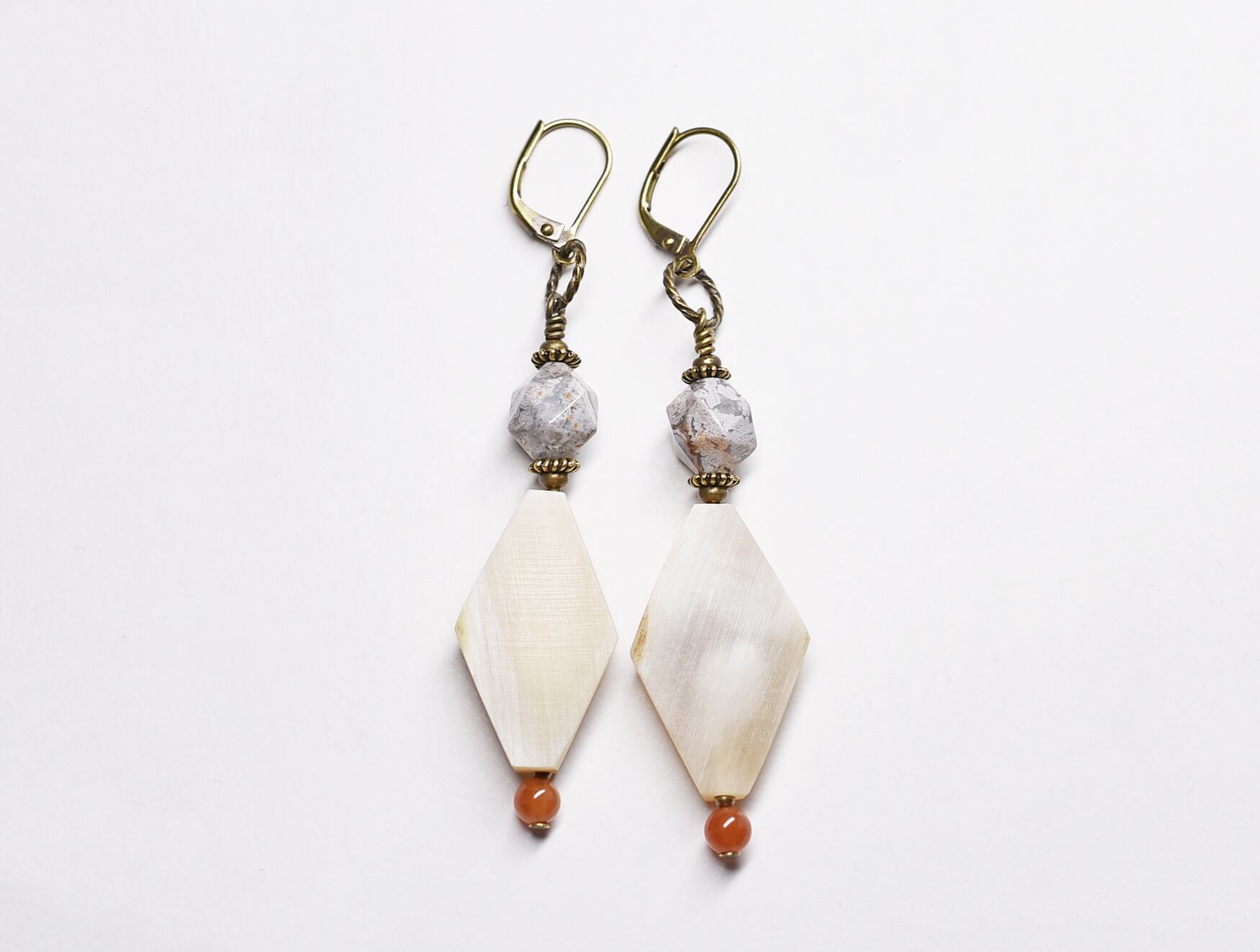 大き目なホーンビーズ、ラグナレースアゲートとルチルクォーツを繋いだピアスです。