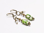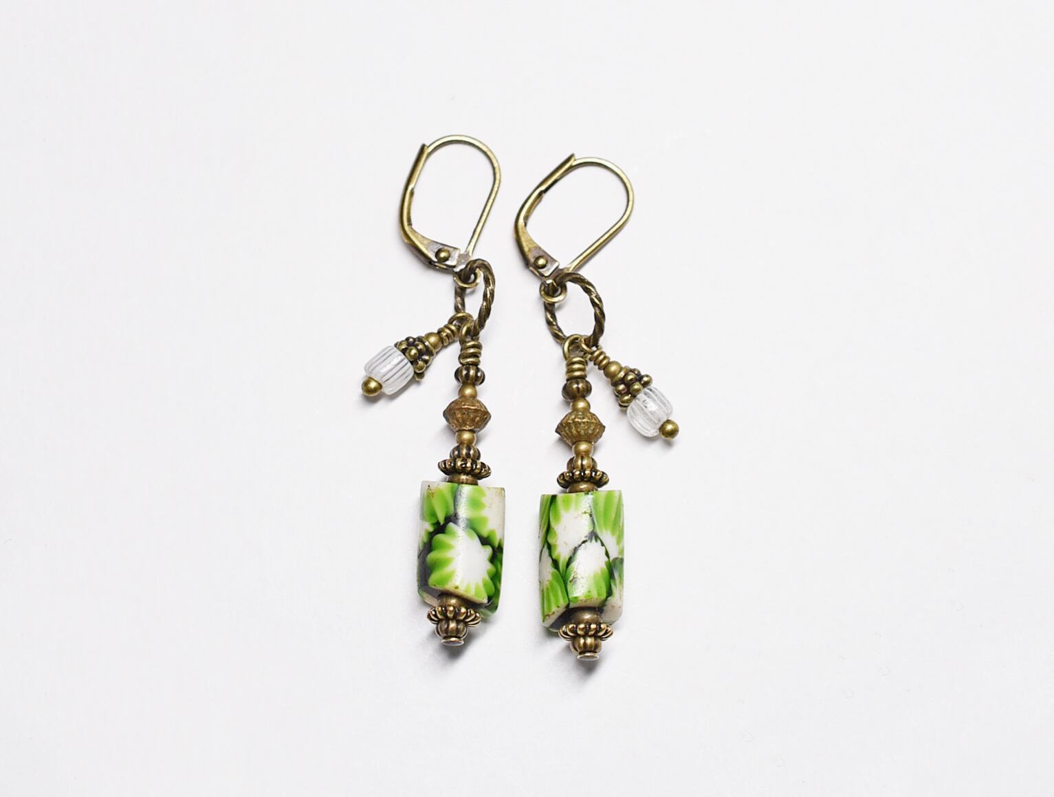 ミルフィオリ(千の華)と呼ばれるアンティークのベネチアビーズ(19~20世紀)とブラスビーズ、グーズベリーを繋いだピアスです。