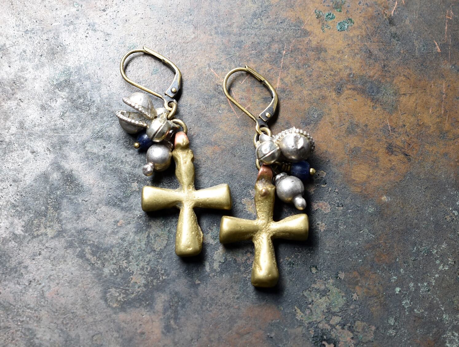 エチオピアンクロスと鈴、ダークブルーアンティークビーズのピアス