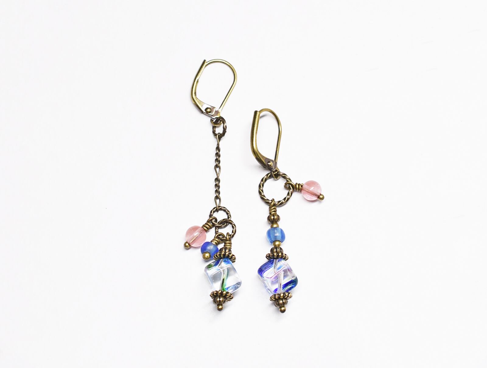 アイリスガラスと呼ばれるチェコ産のヴィンテージビーズと、チェリークォーツ、小さなアンティークビーズを繋いだピアスです。