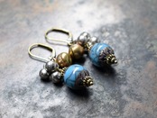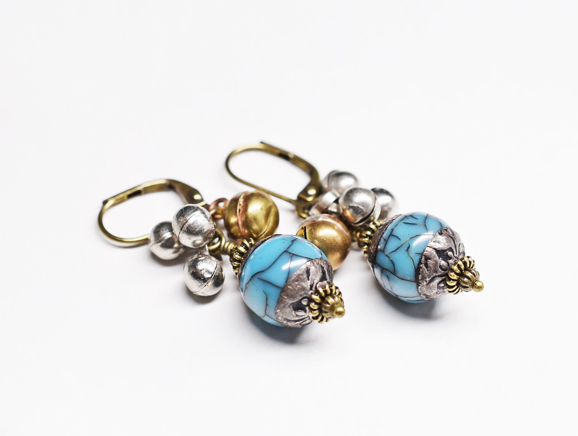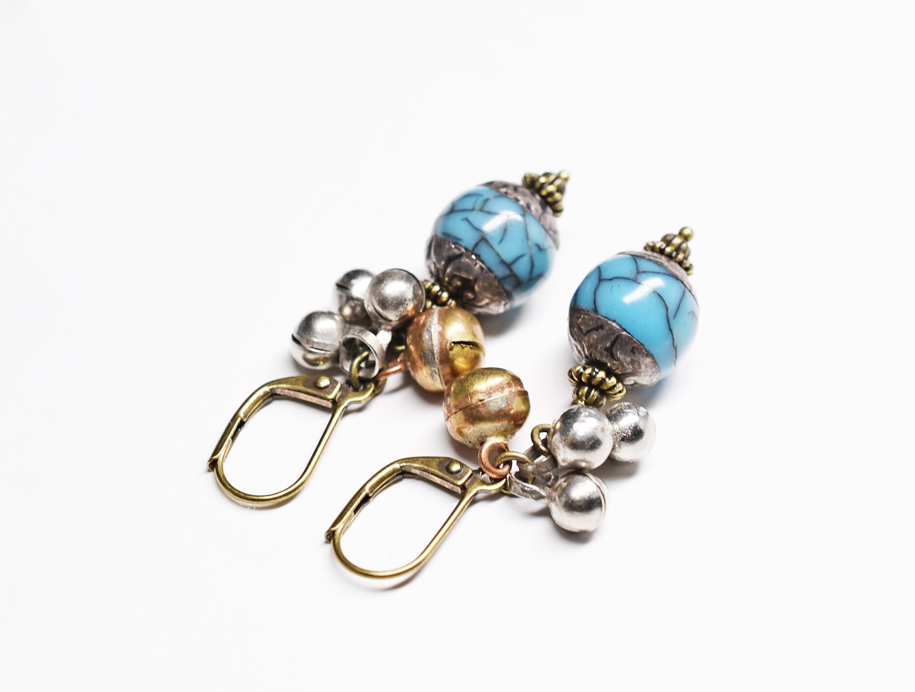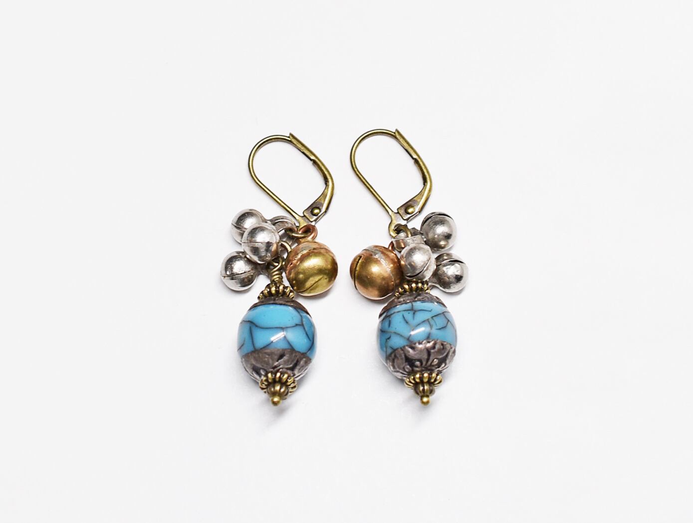 ターコイズブルー色アフガニスタンパーツと2種類の鈴ピアス