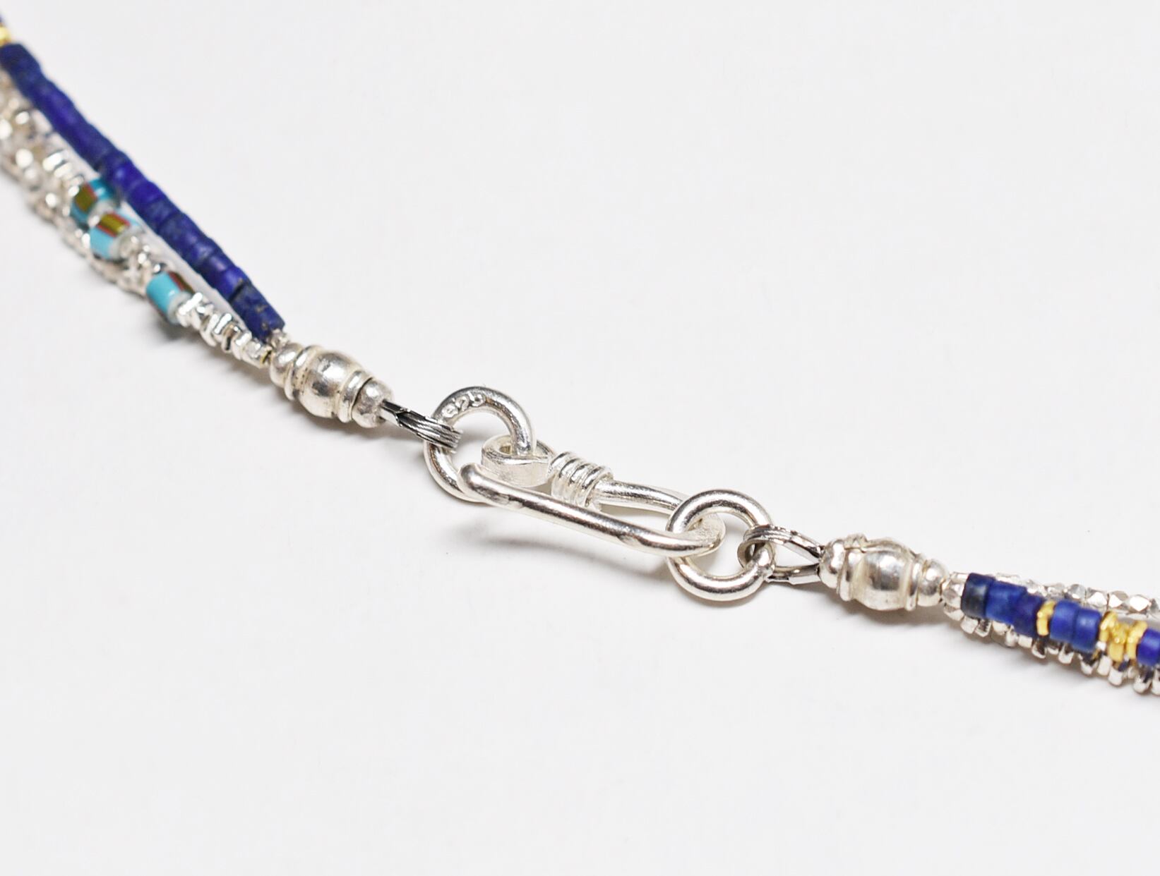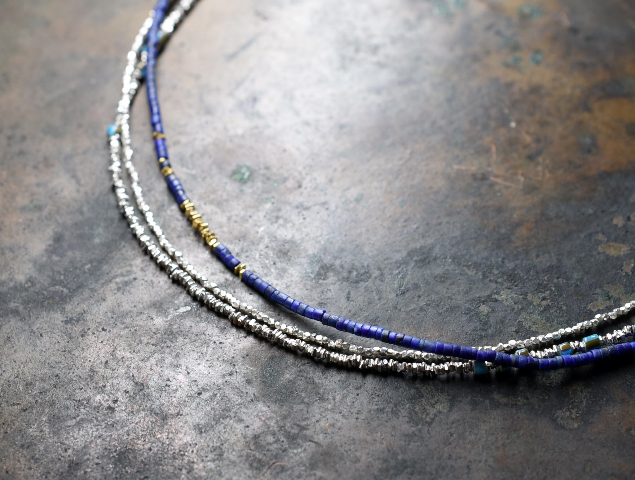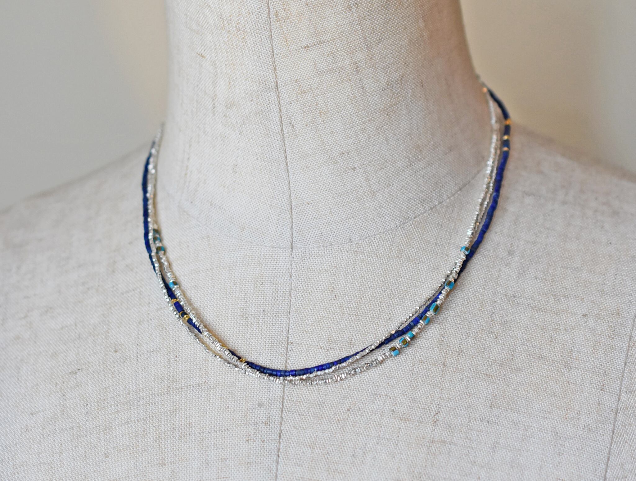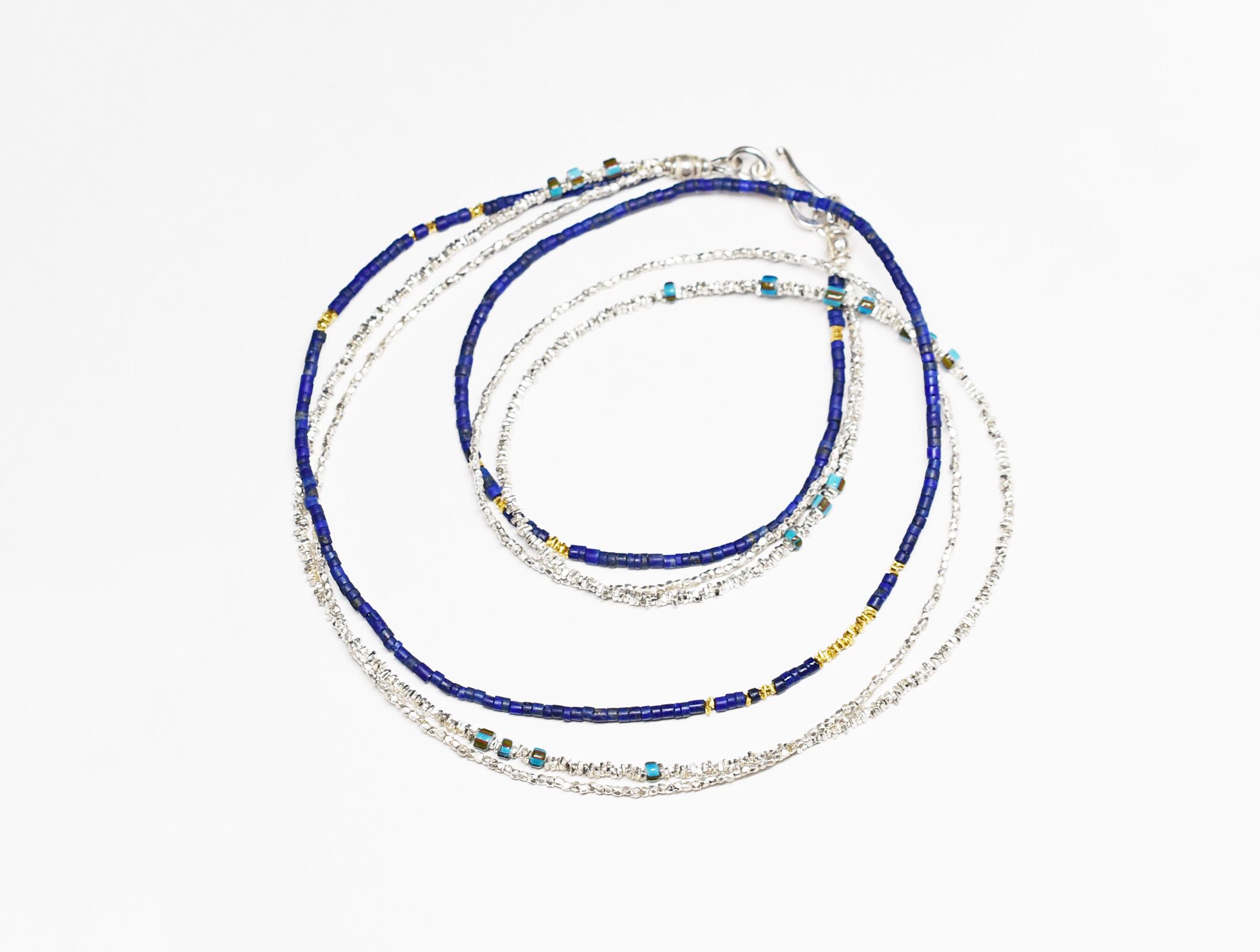 小さなラピスラズリと、小さなカレンシルバービーズを繋いだ3連のネックレスです。