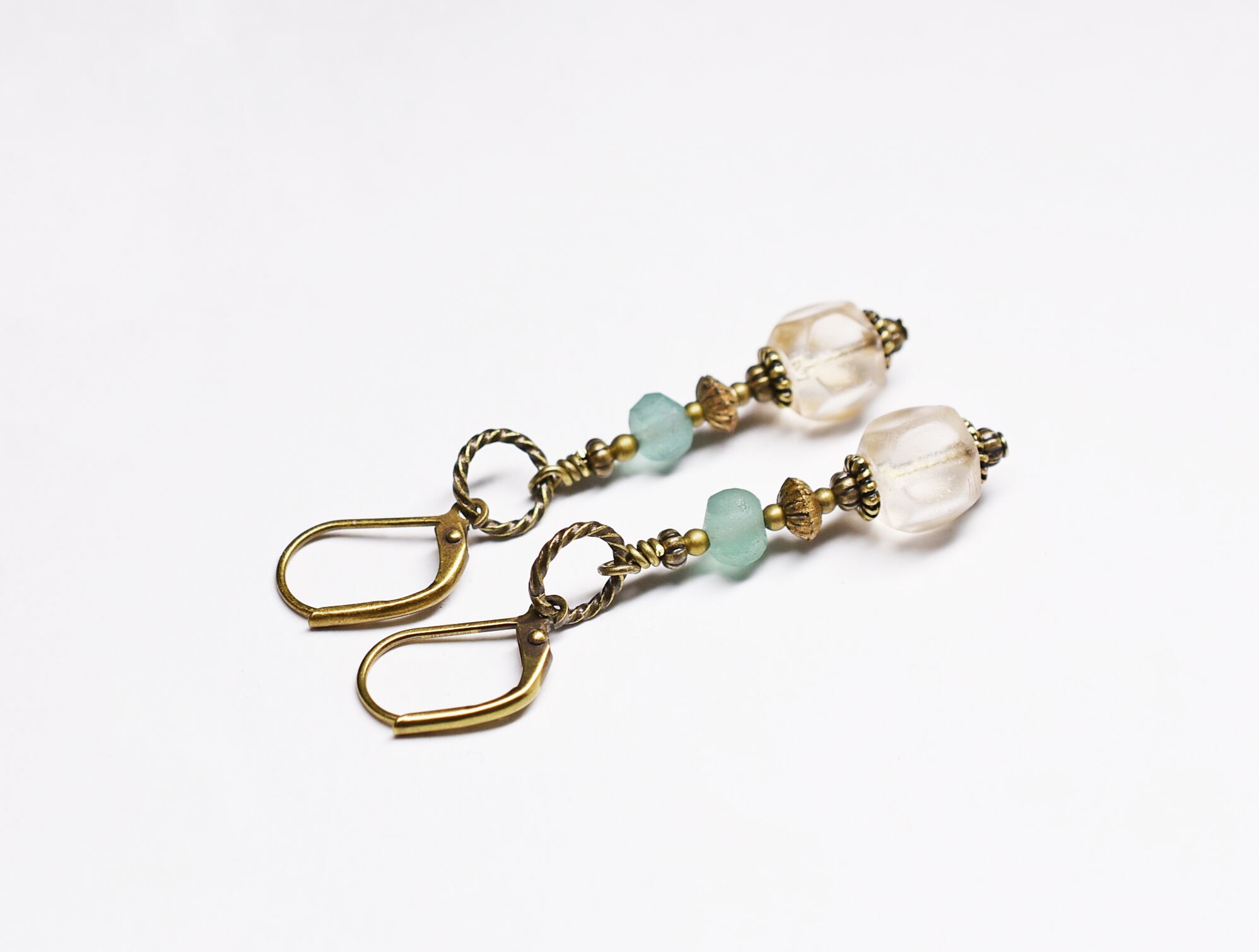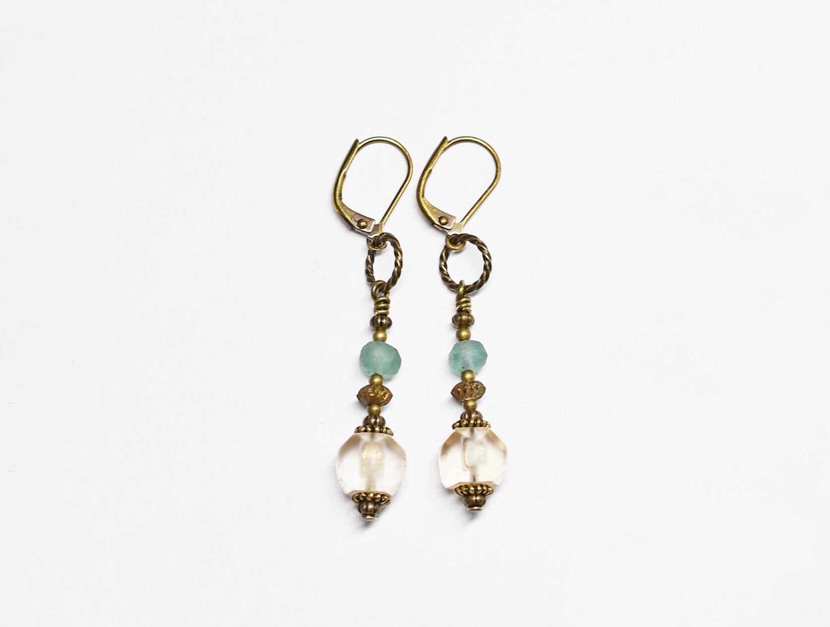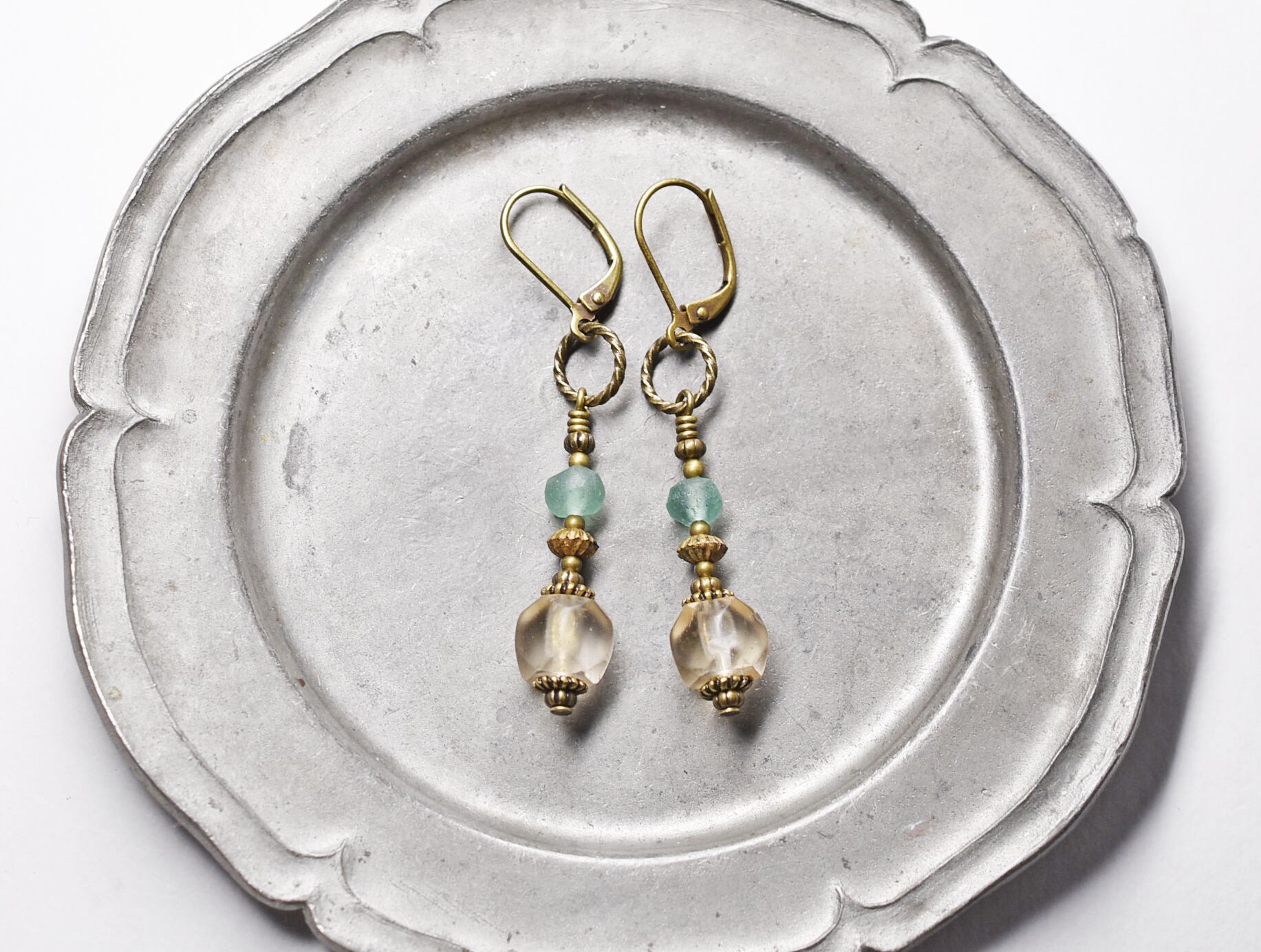アンティークボヘミアビーズと雨粒ローマングラスのピアス