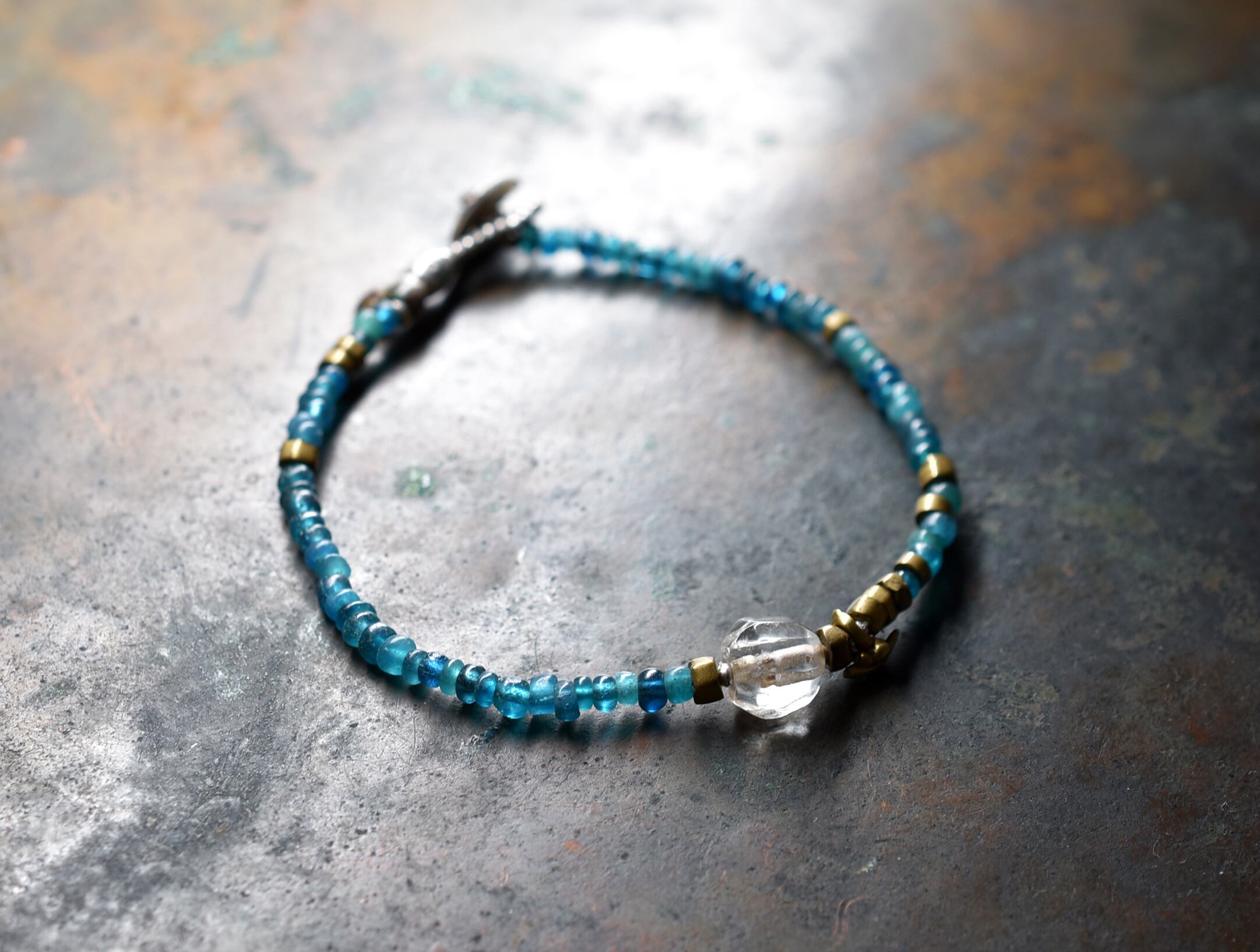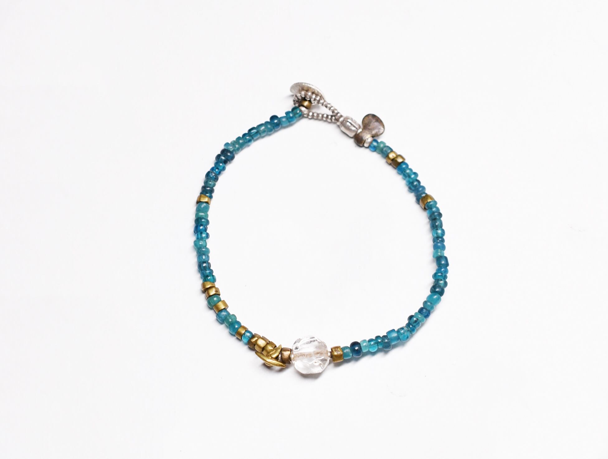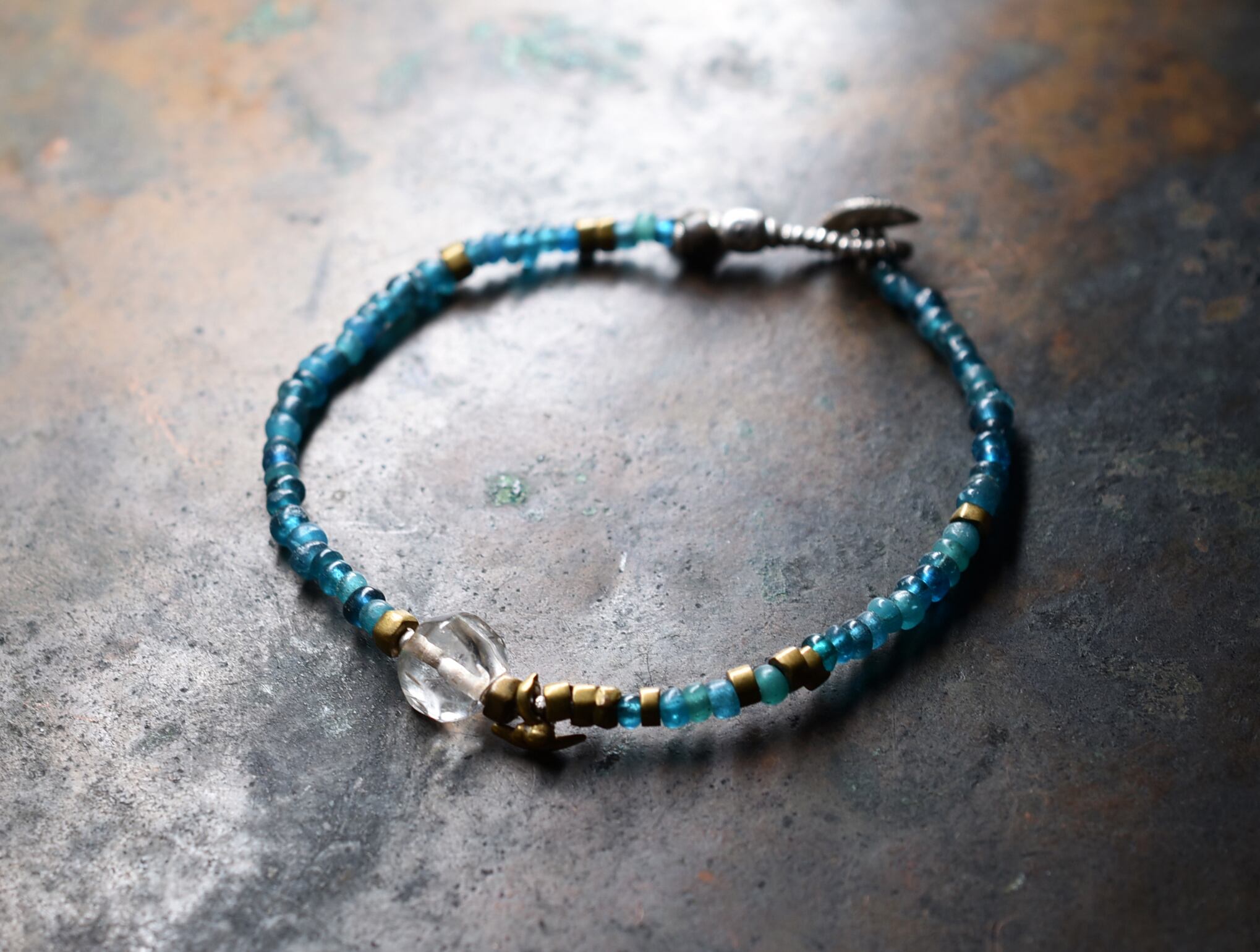 古代水晶をエメラルドブルーのアンティークビーズ、oldオリッサブラスで繋いだブレスです。
