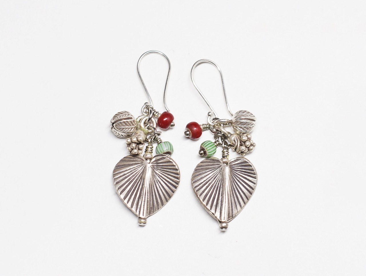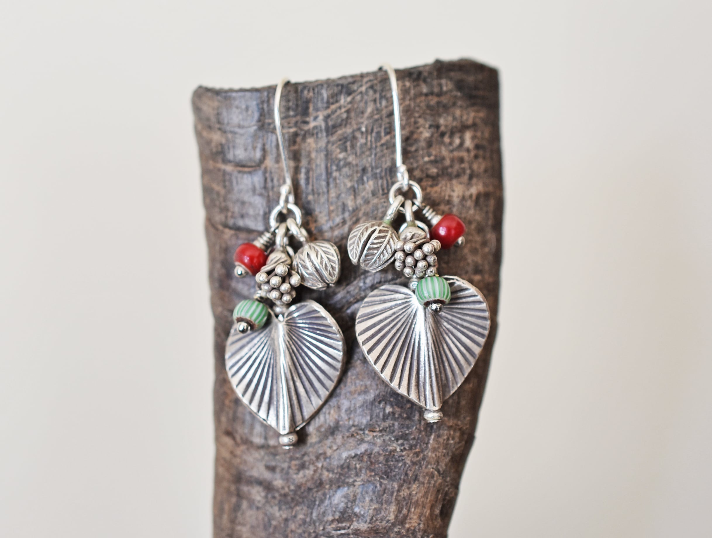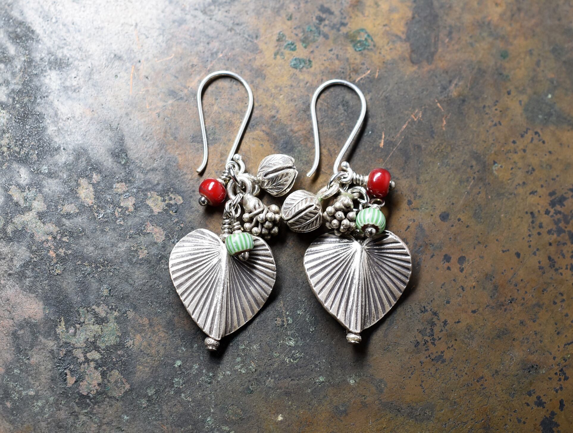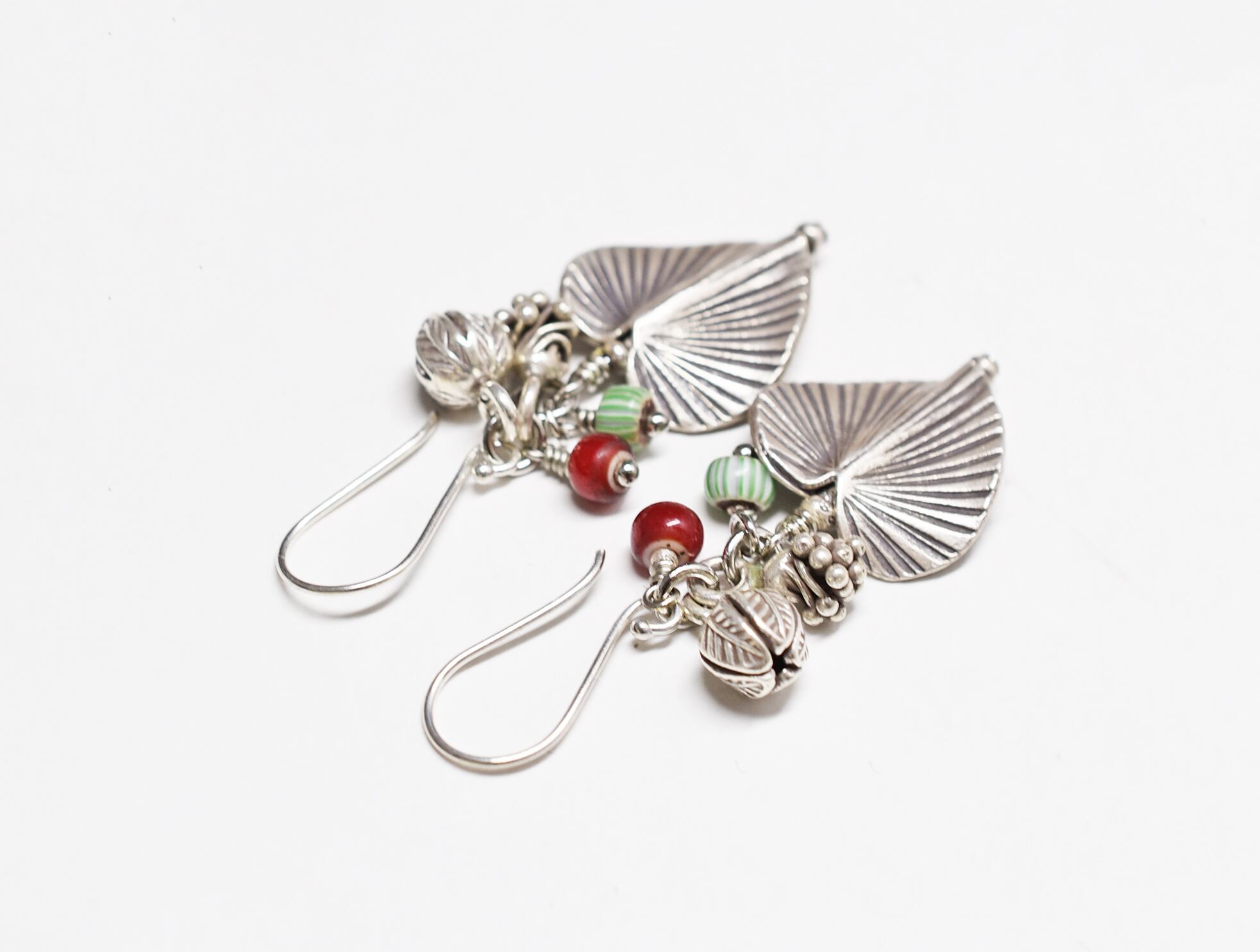 葉っぱと、蕾のような2種類のカレンシルバーと、赤とグリーんのアンティークビーズを繋いだピアスです。