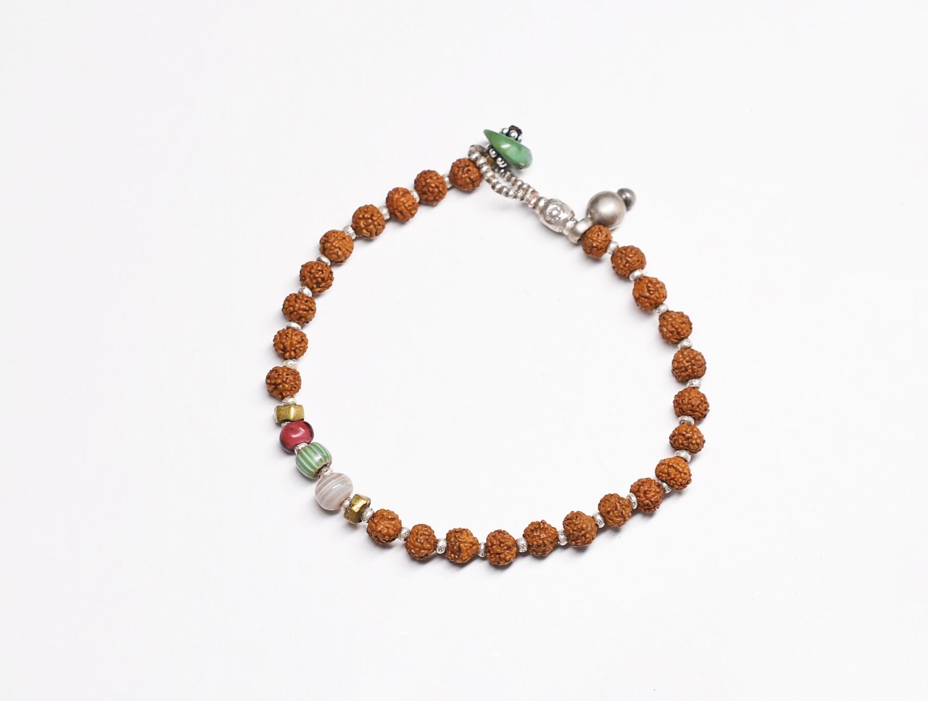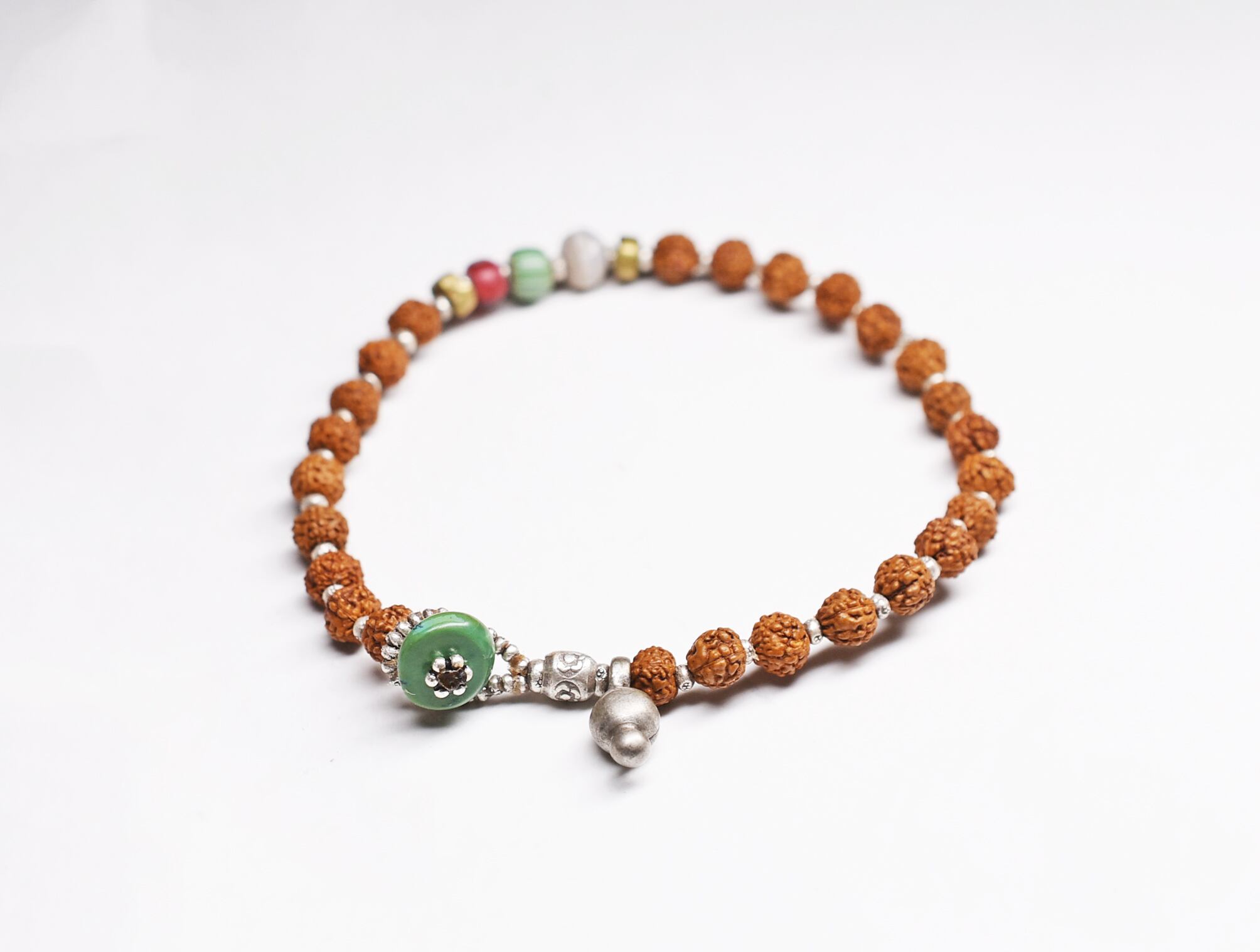 小さなルドラクシャは、マーラー(数珠)のために繋げられていたものを使用しています。今は明るめな茶色をしていますがたくさん身に着けてみただくと肌の脂などでもっと濃いお色へ変化していくと思います。
