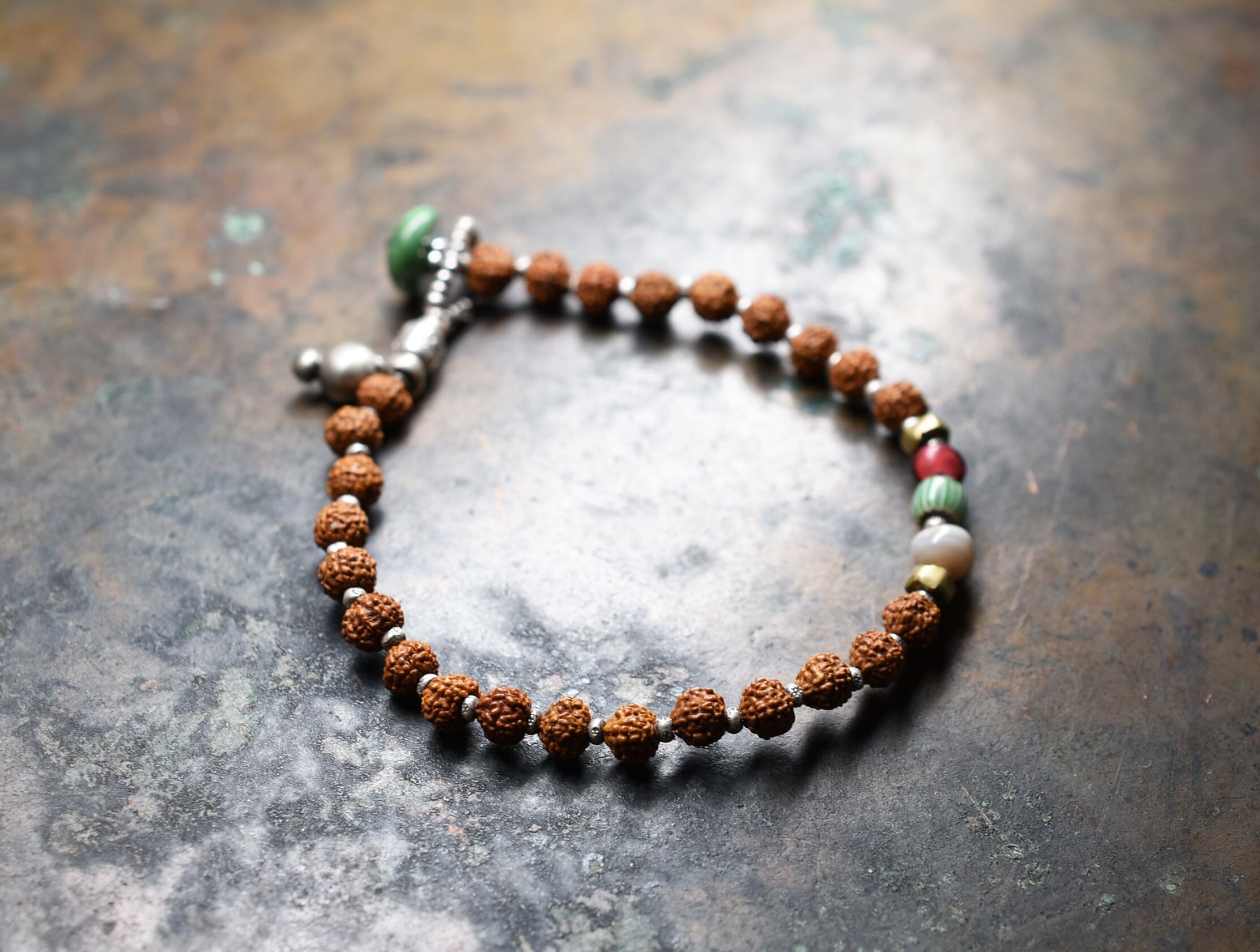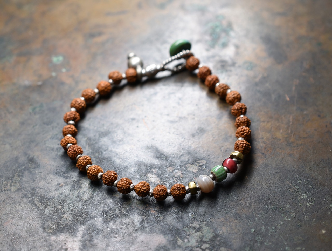 小さなルドラクシャと古代瑪瑙、グリーンシェブロンと金赤ホワイトハーツのブレス