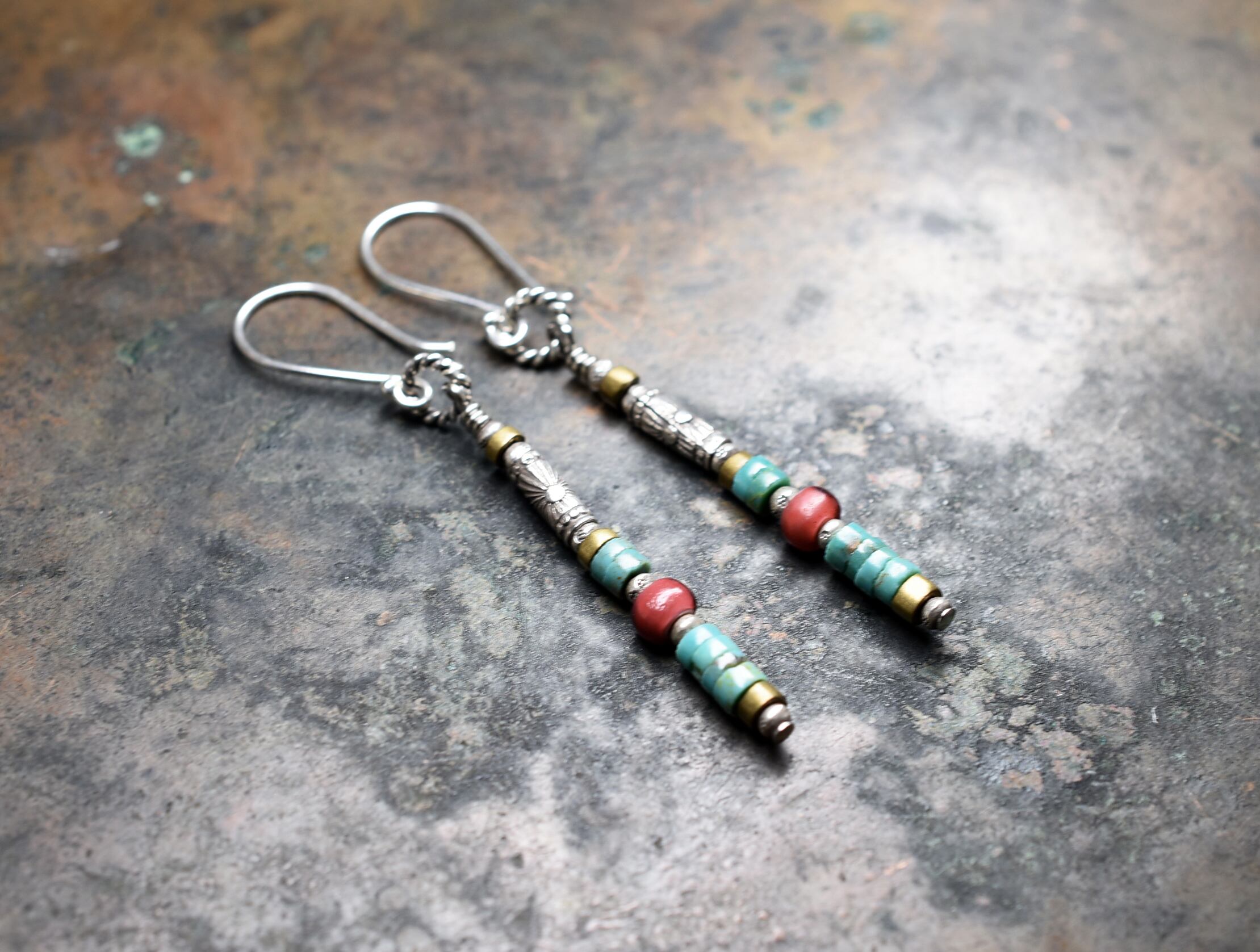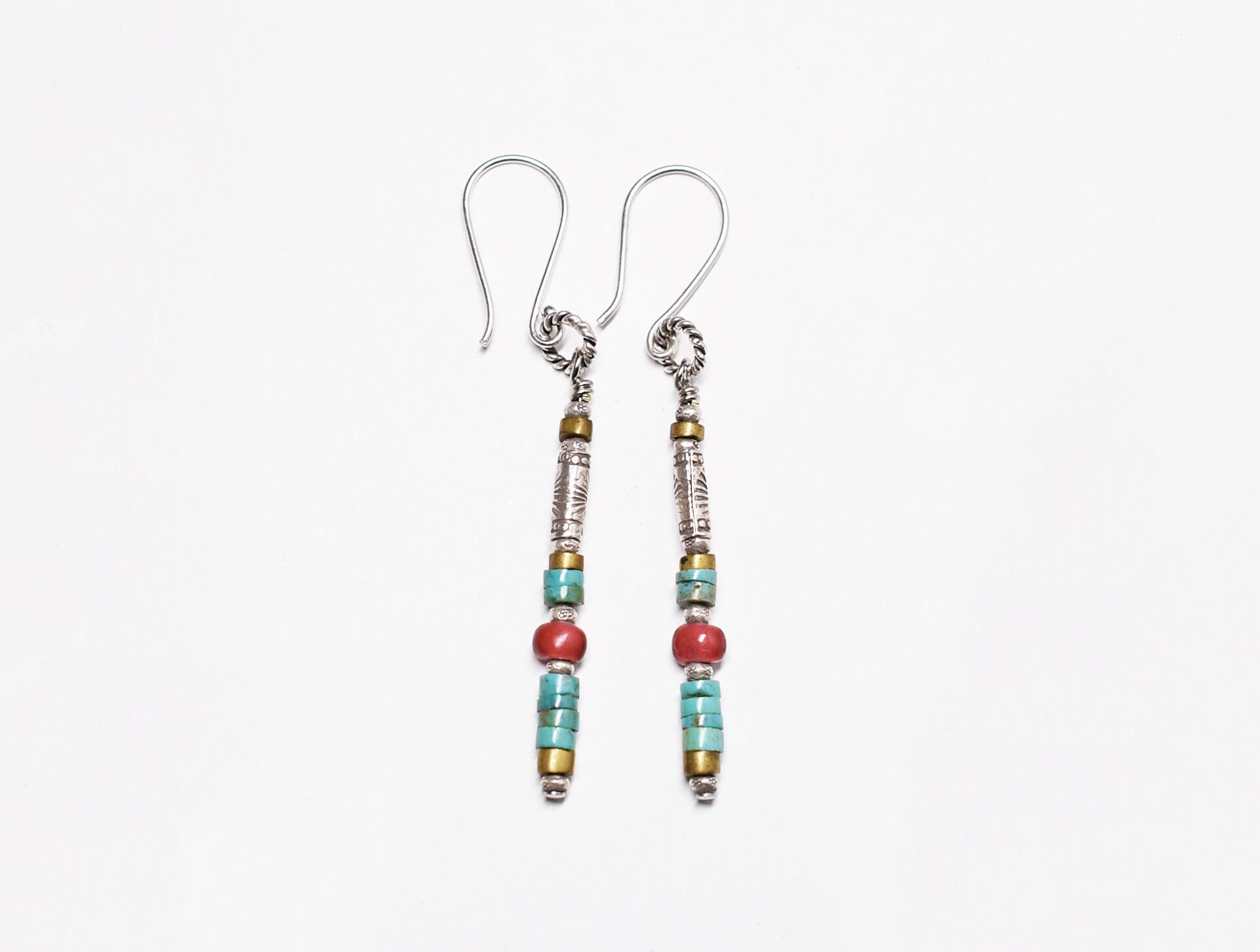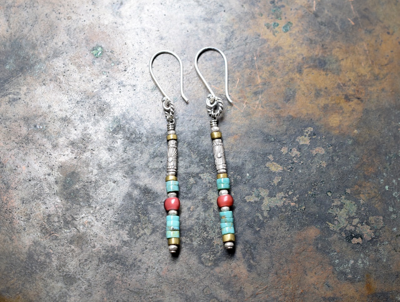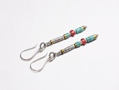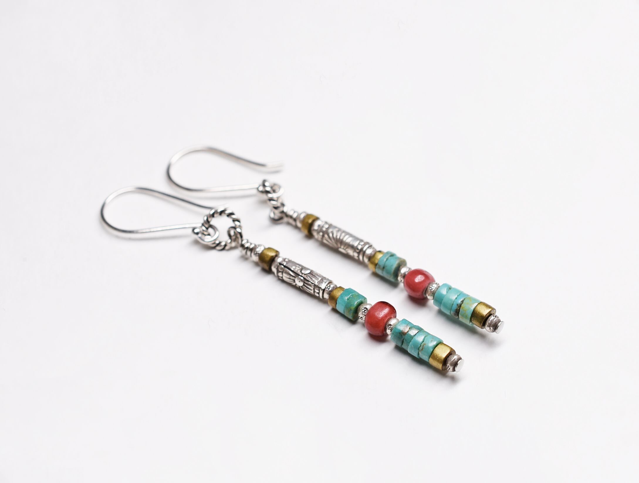 ターコイズ、カレンシルバー金赤ホワイトハーツ、oldオリッサブラスを繋いだスリムなピアスです。