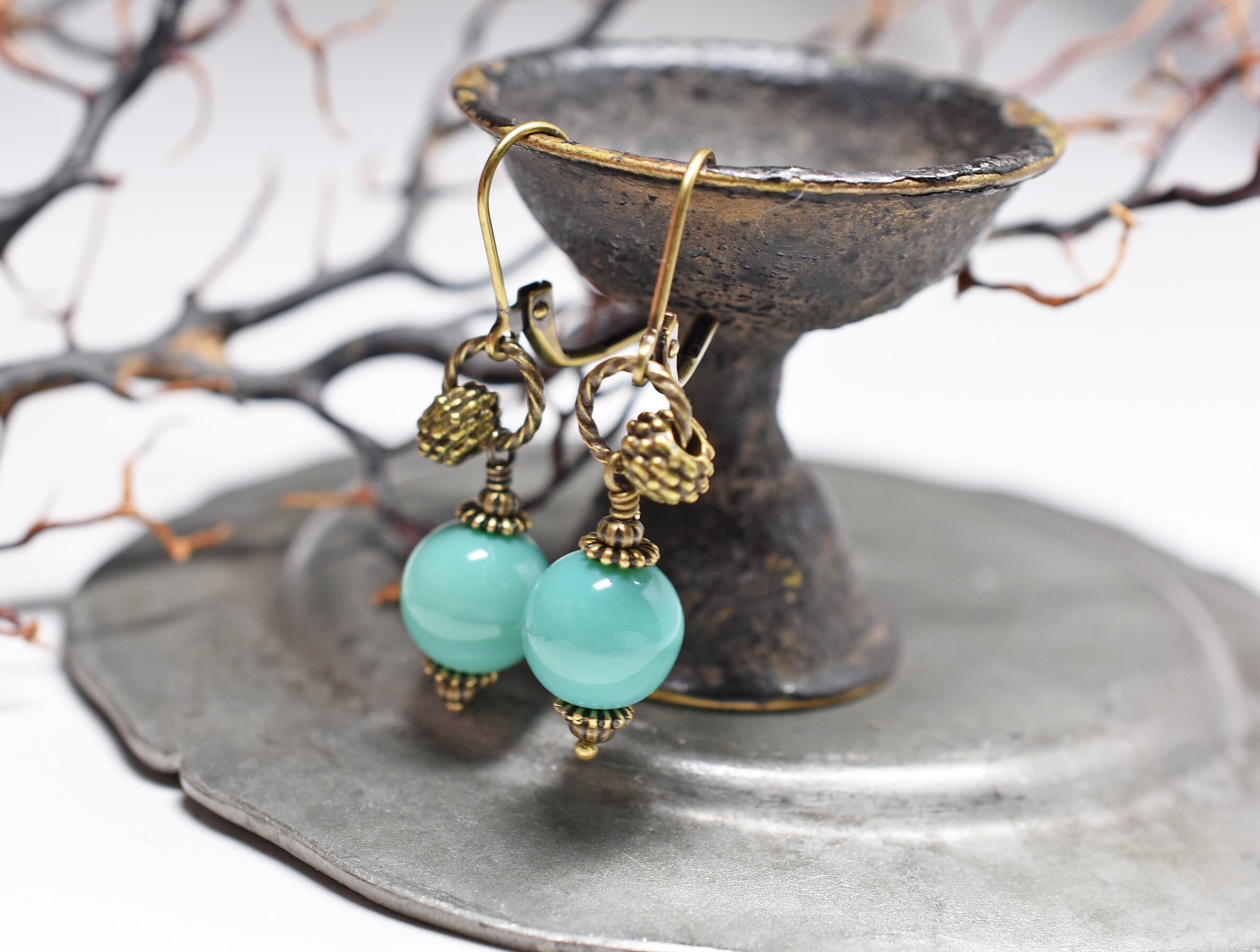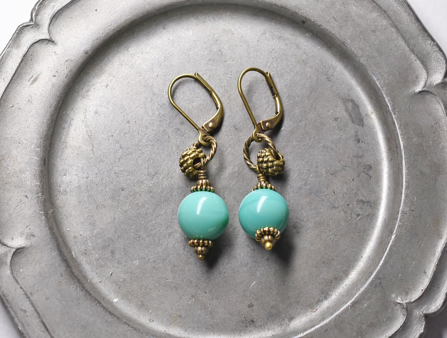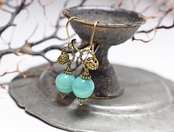 ナイルグリーンチェコビーズと松ぼっくりブラスのリングピアス