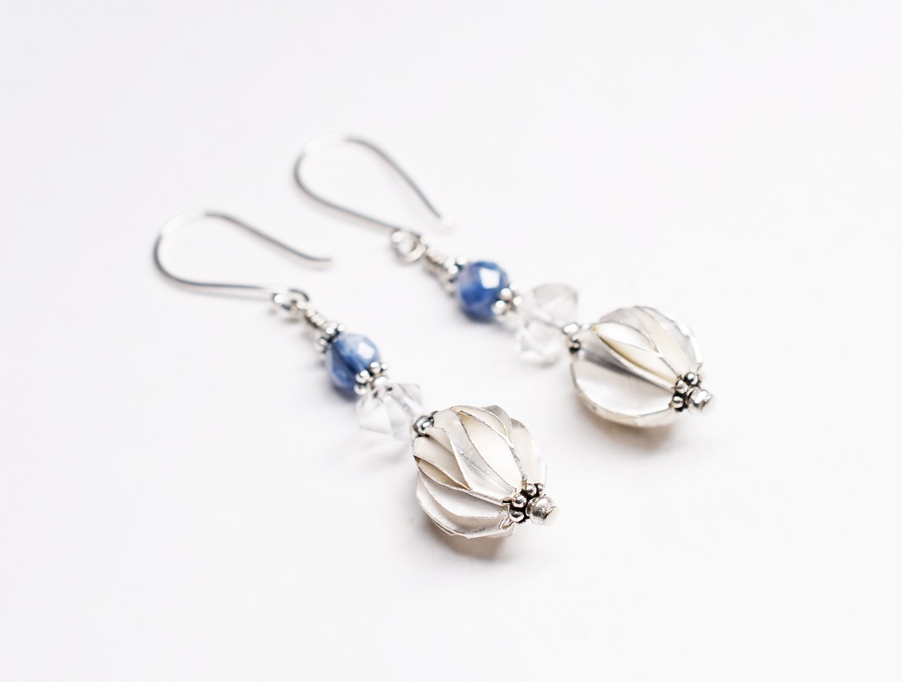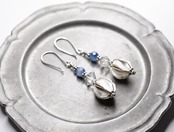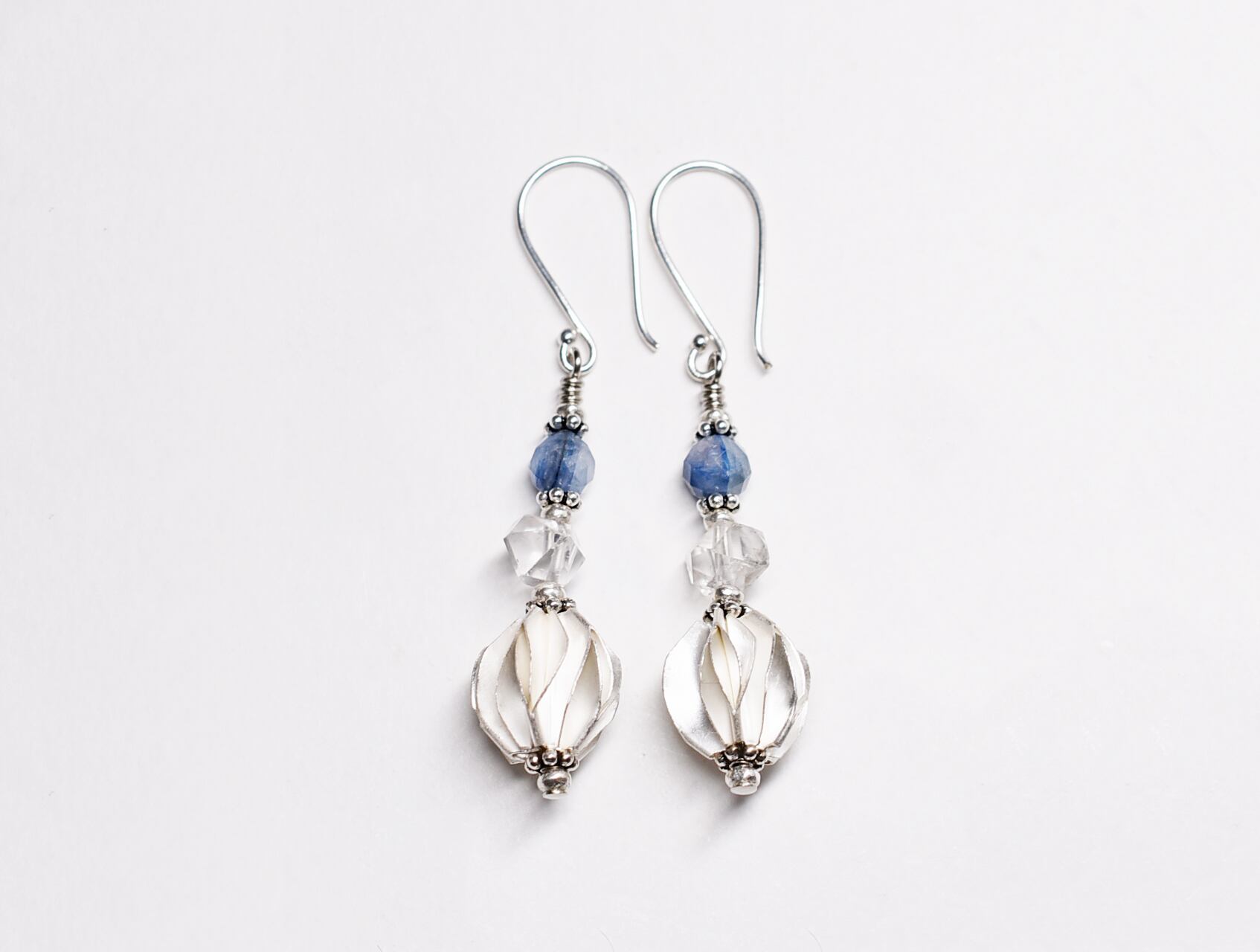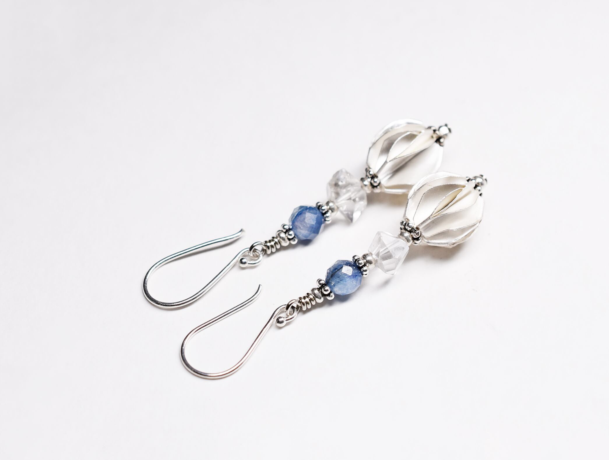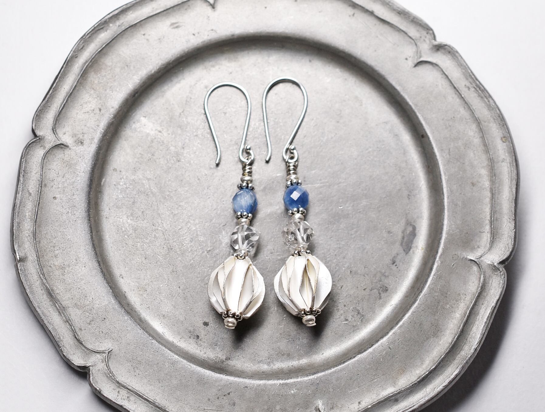 ひらひらのカレンシルバーに、カイヤナイト、水晶を繋げたピアスです。