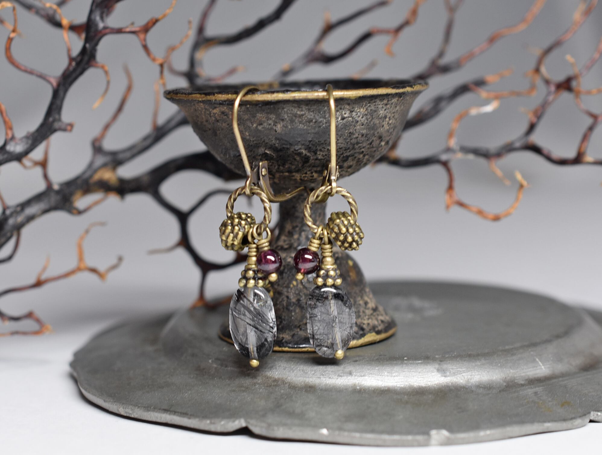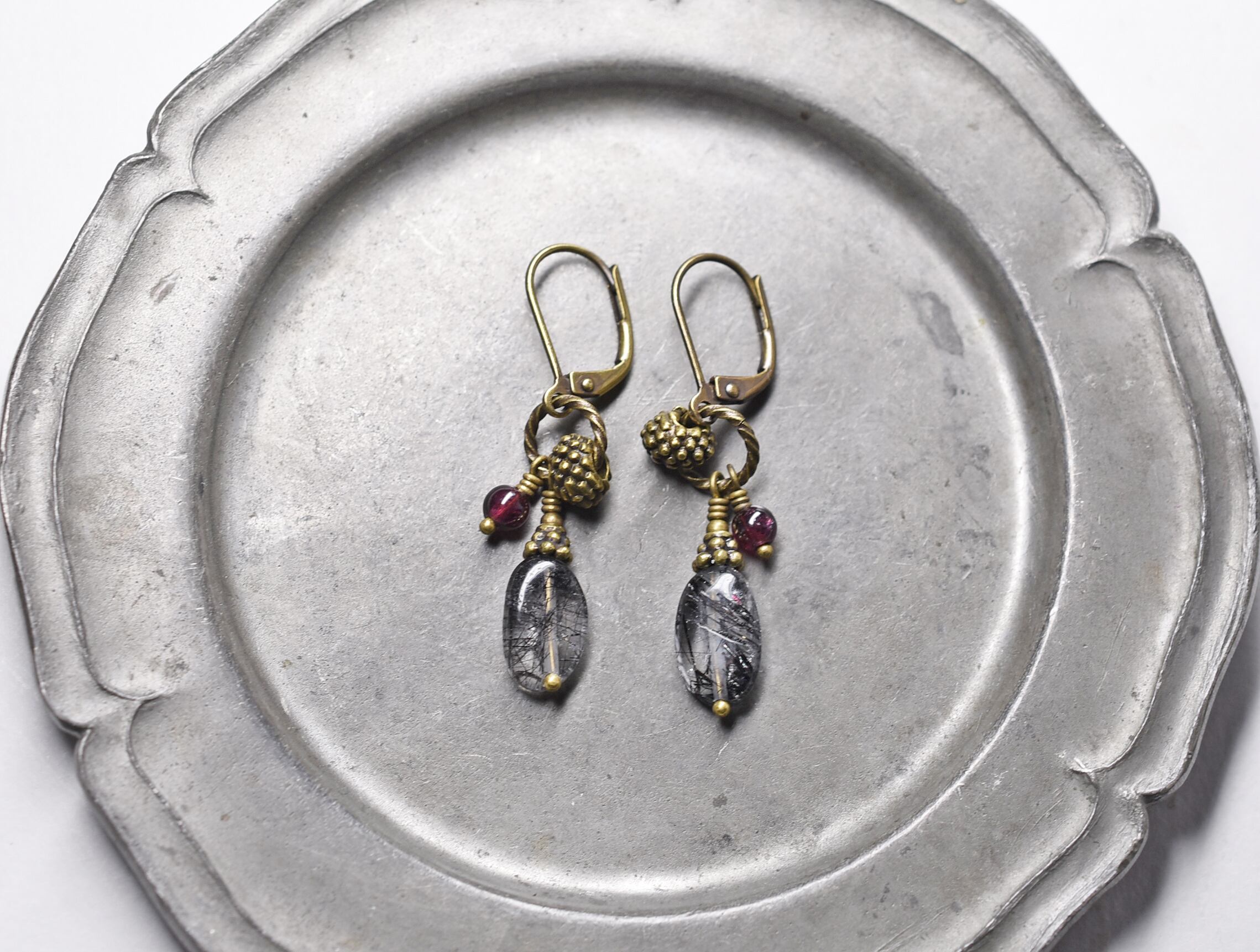 ブラックルチル、ガーネットと松ぼっくりブラスのリングピアス