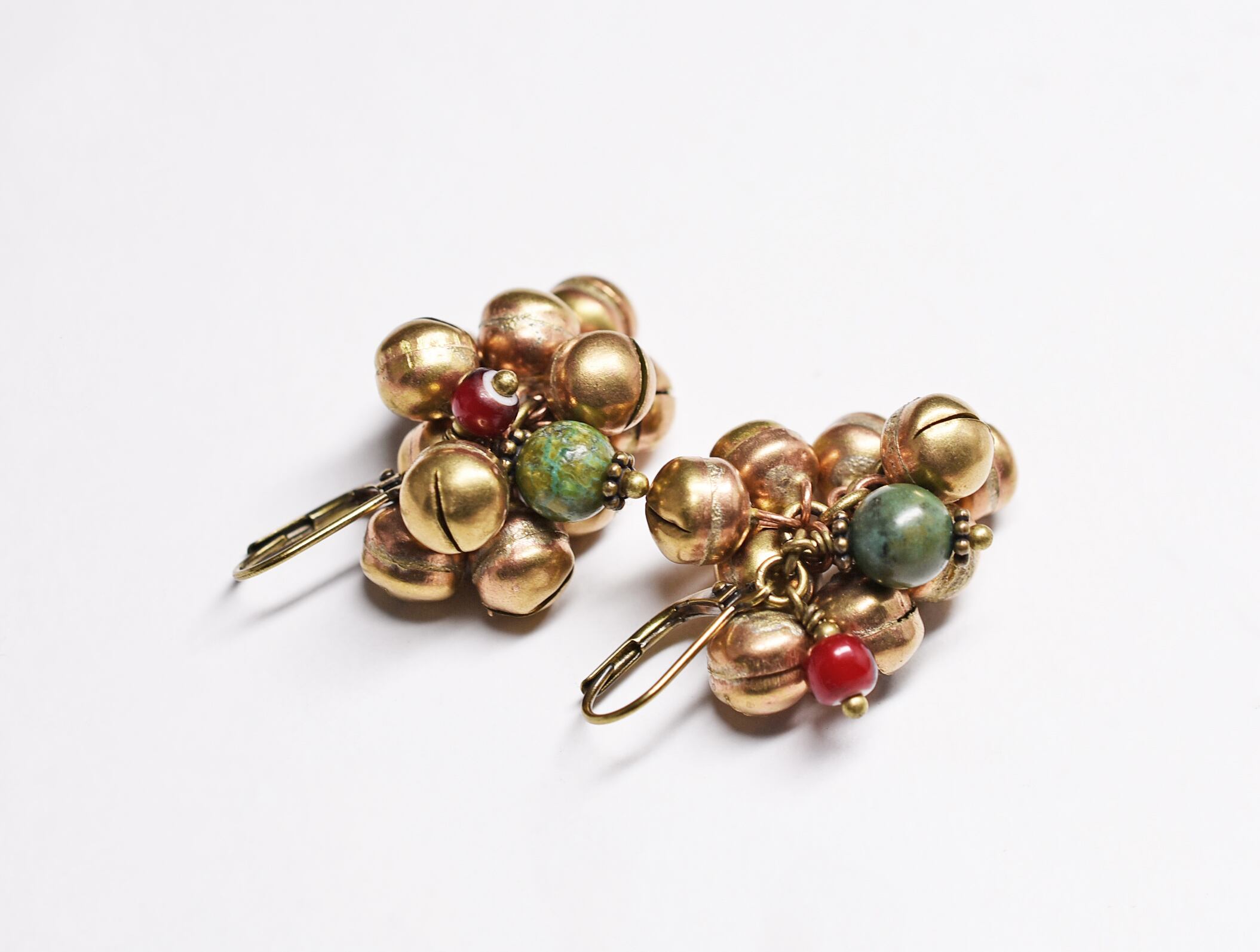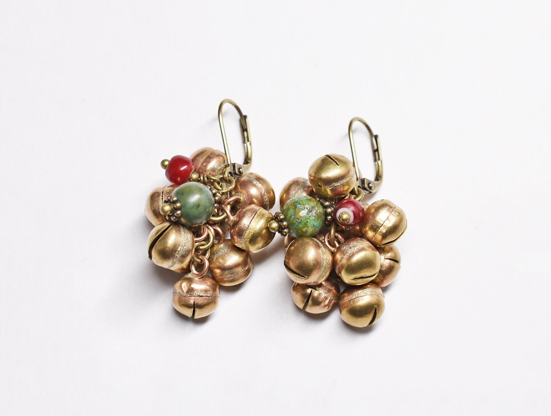 たわわな鈴とターコイズ、濃赤色ホワイトハーツのピアス