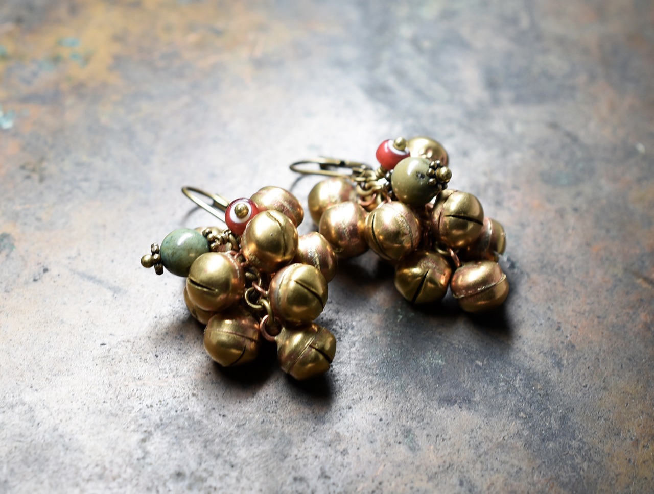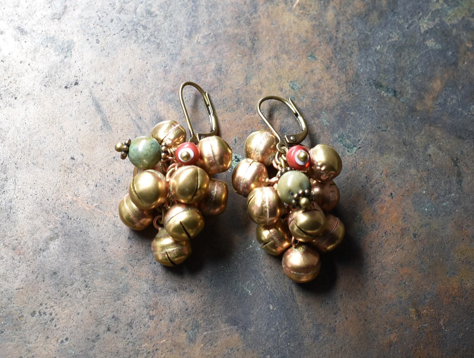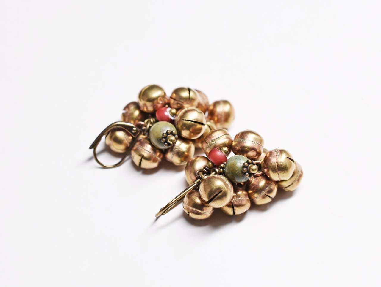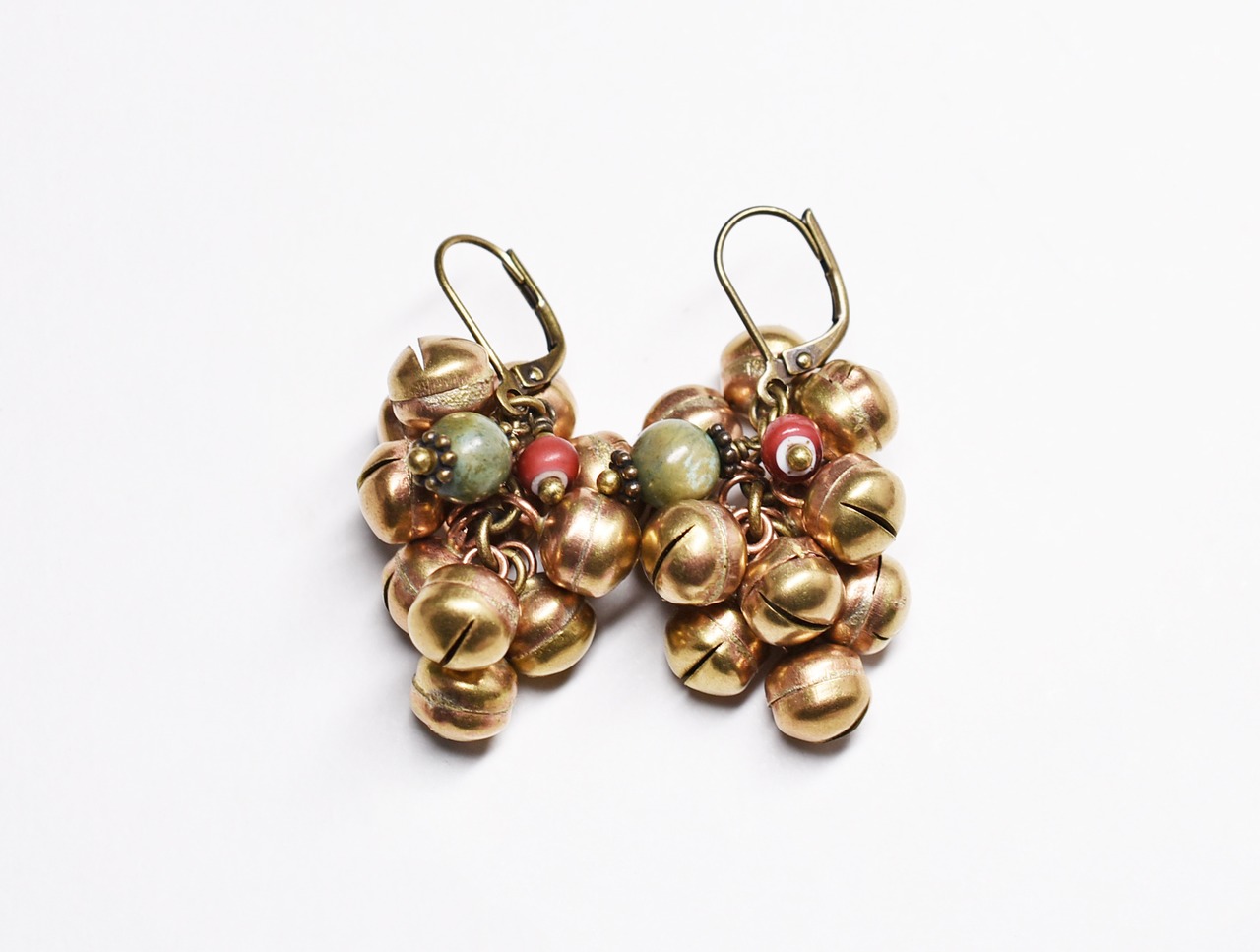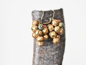 たわわな鈴とターコイズ、金赤色ホワイトハーツのピアス