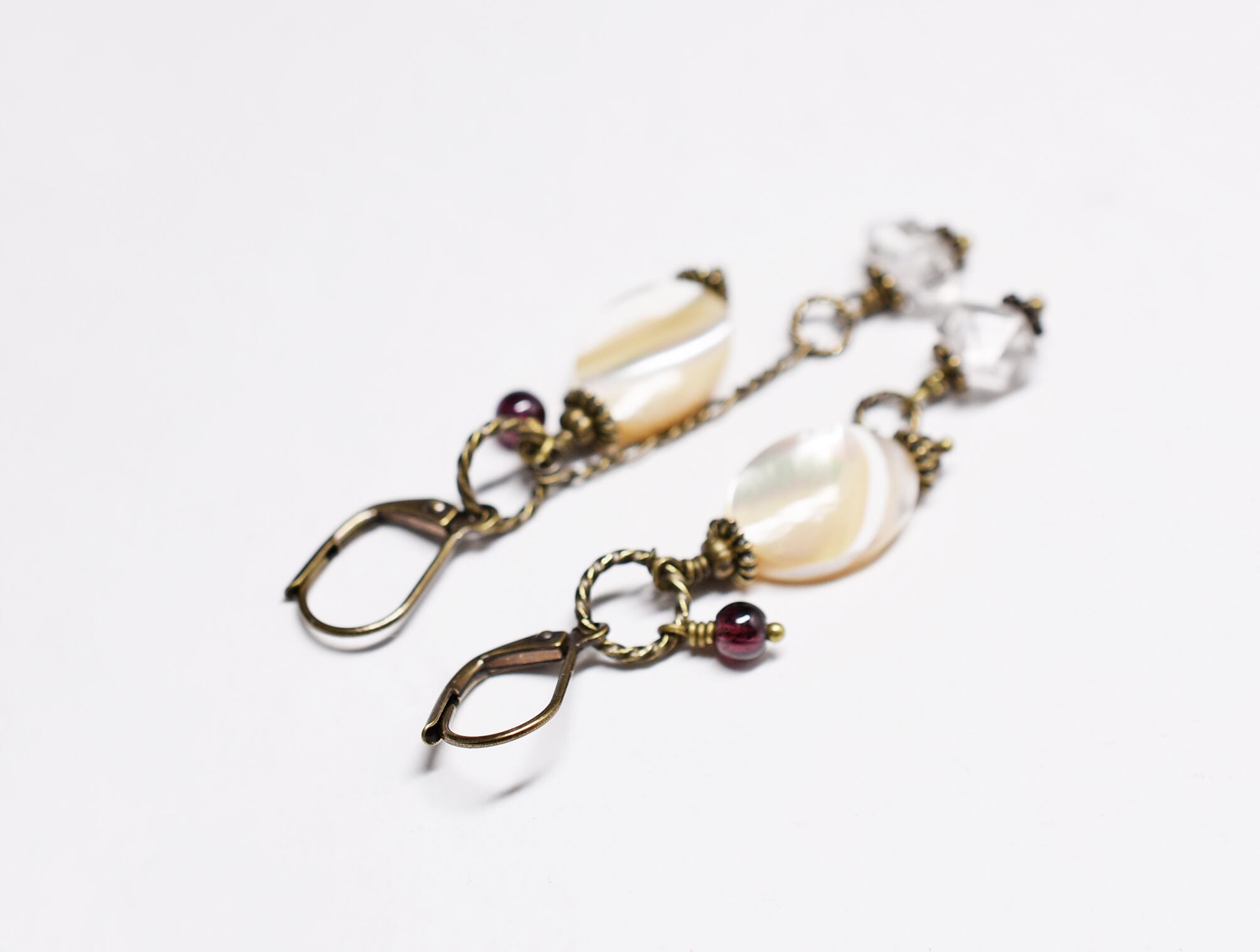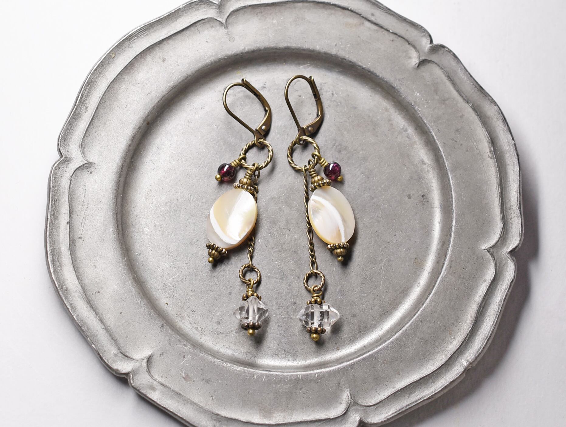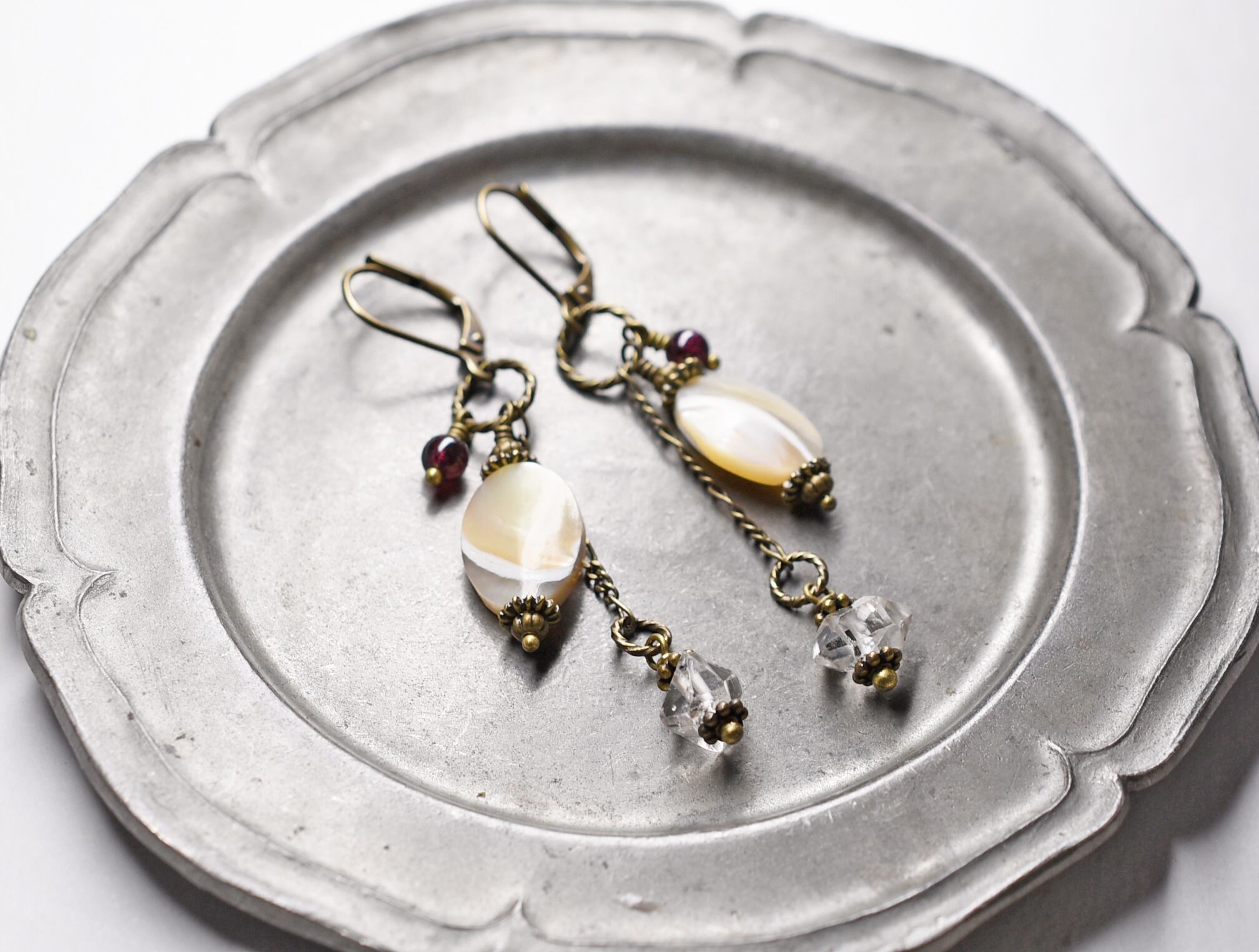 マザーオブパールと水晶、ガーネットと鈴を繋いだピアスです。