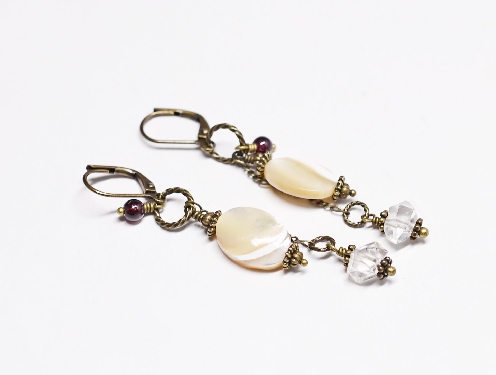 マザーオブパールと水晶、ガーネットのチェーンピアス