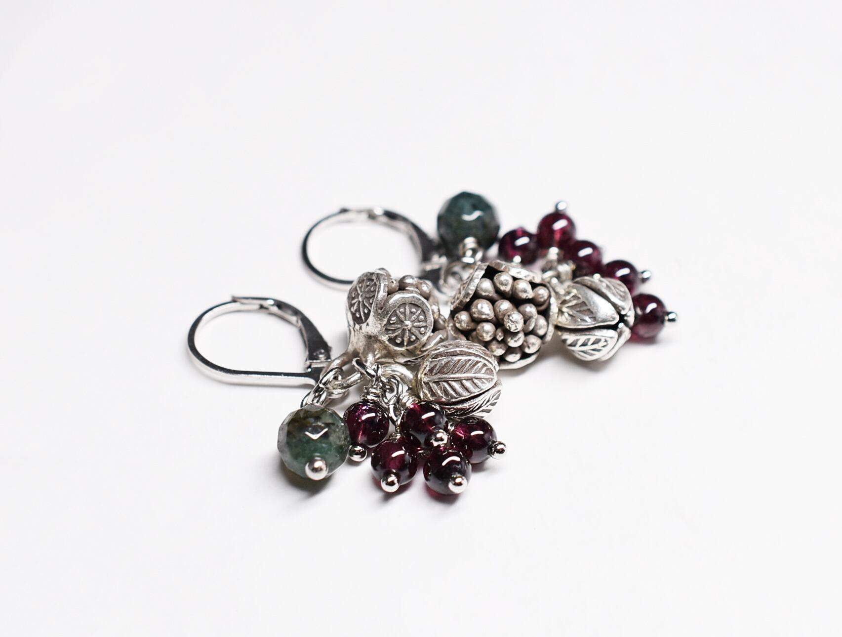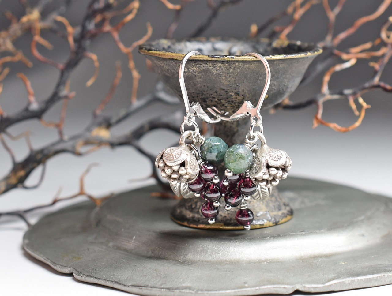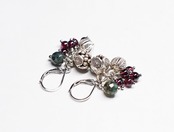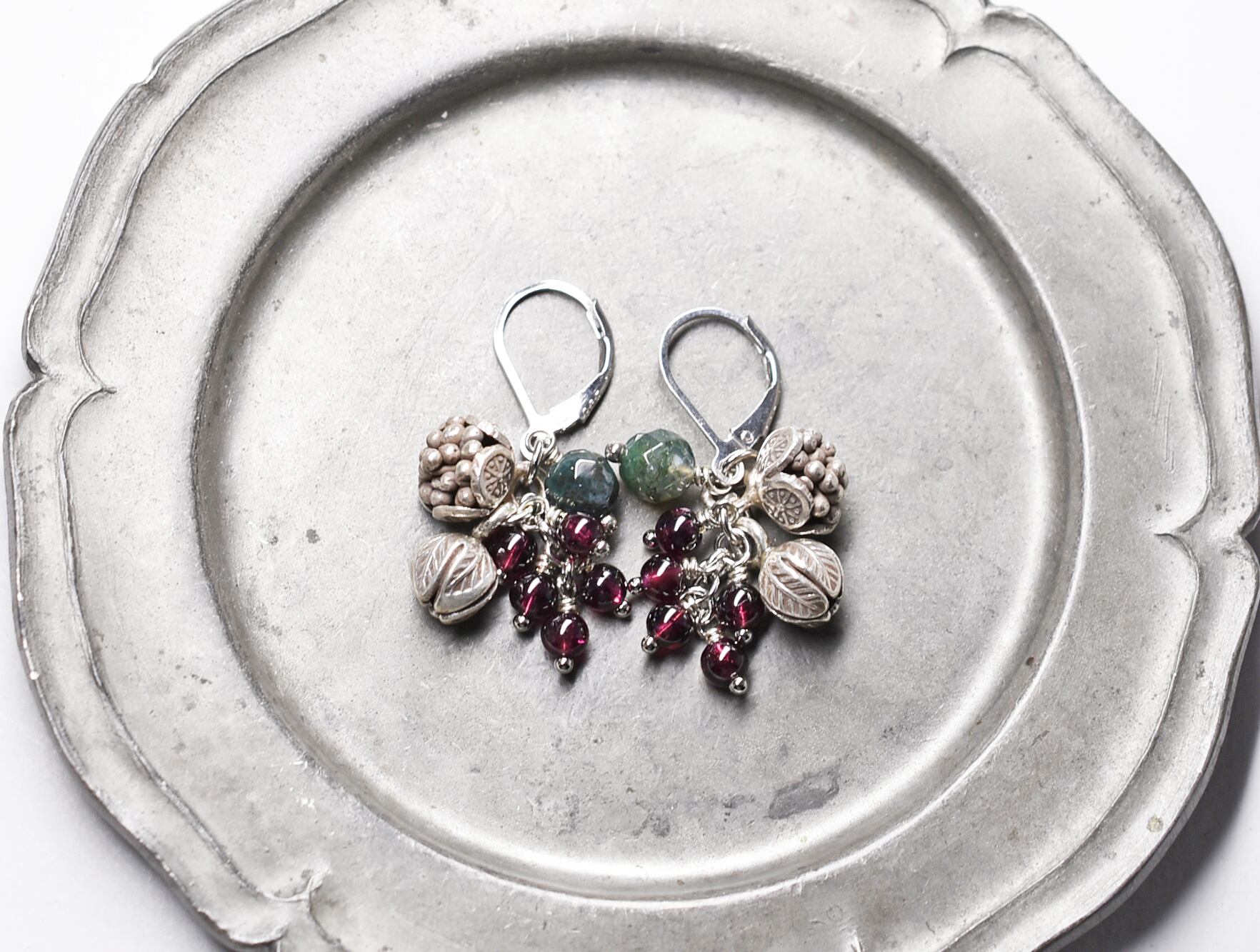 たわわなガーネットとインディアンアゲート、丸いお花と蕾のカレンシルバーを繋いだピアスです。