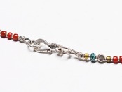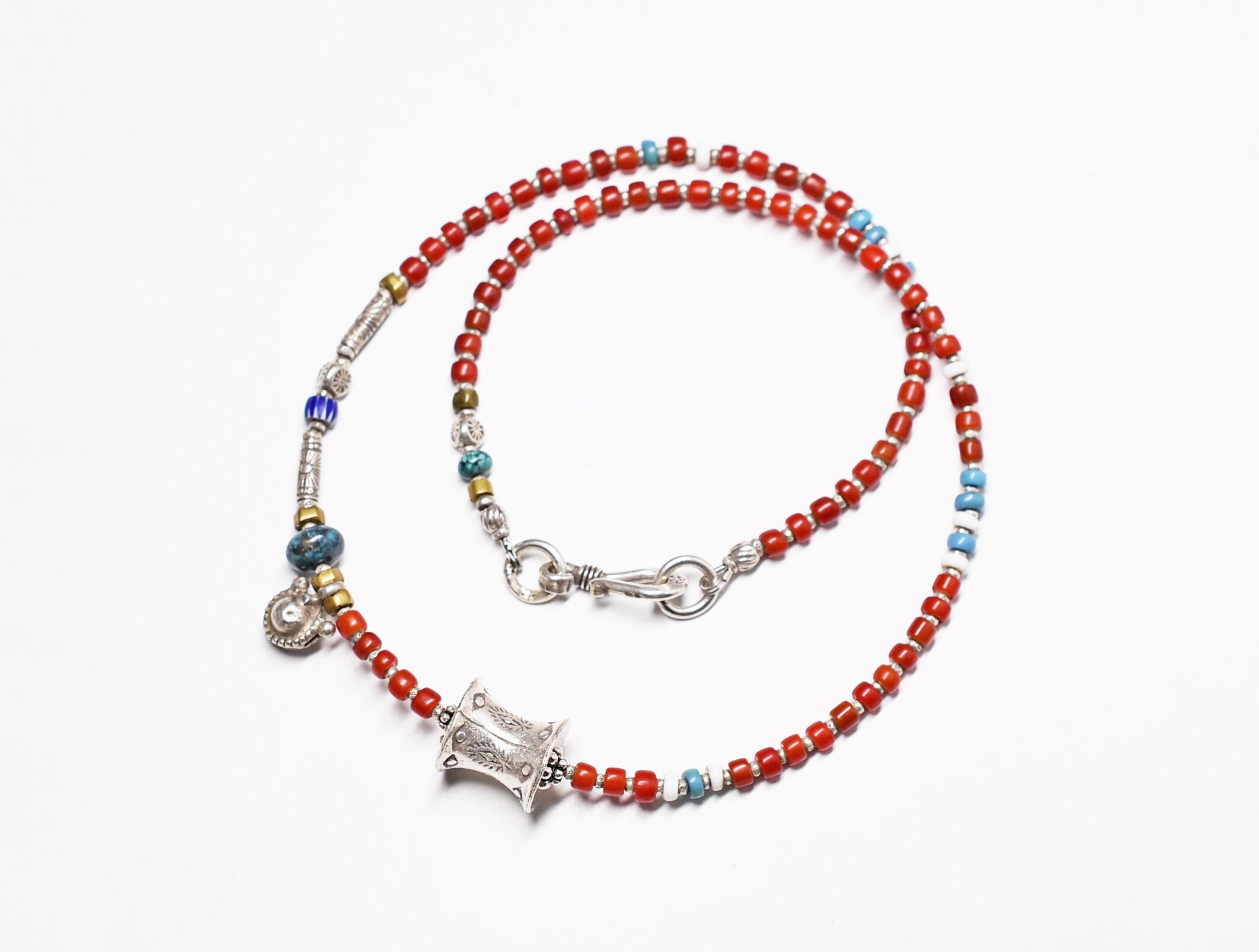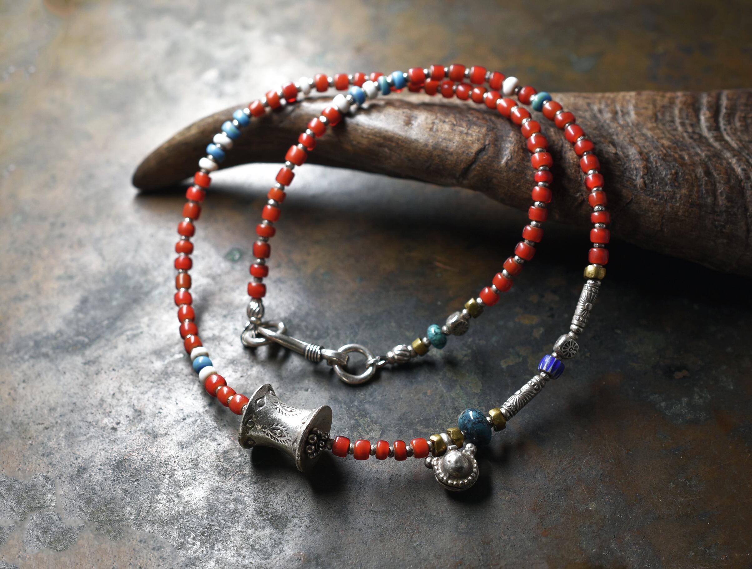 赤色のビーズはホワイトハーツと呼ばれるアンティークビーズです。芯(ハート)部分が白いことからこう呼ばれています。こちらは19~20世紀頃のベネチア産のビーズです。一粒づつ色合いや形状が少し異なります。