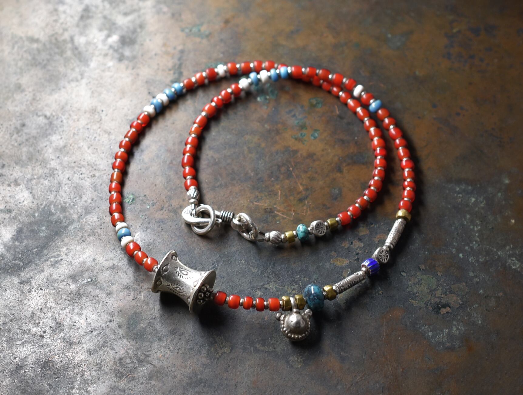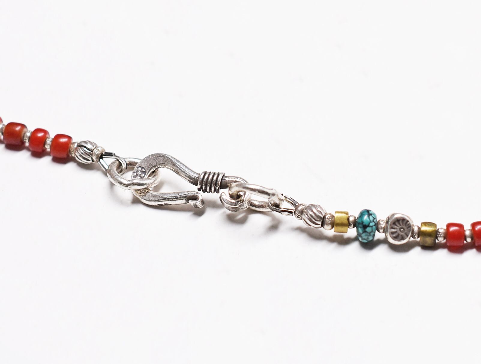 カレンシルバーのトップとホワイトハーツ、ターコイズ、インドoldシルバーチャームなどを繋いだネックレスです。