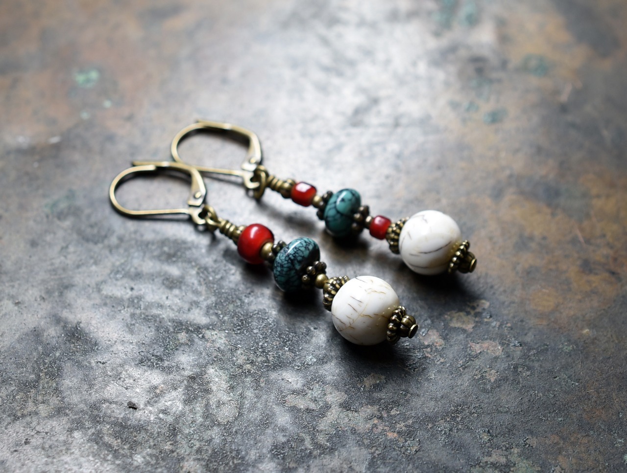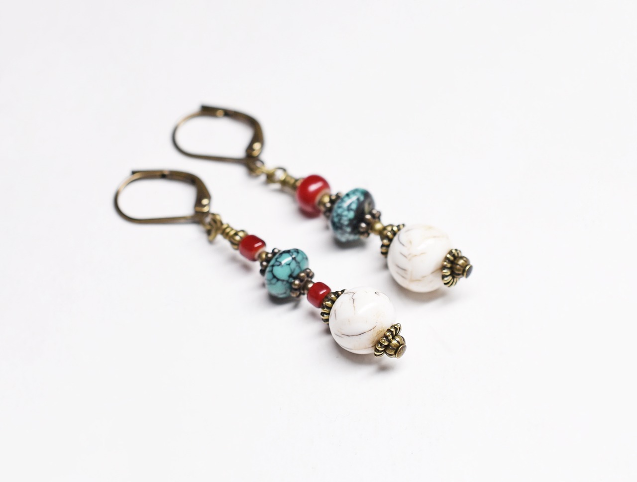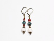 白い貝ビーズと、ターコイズ、ホワイトハーツを繋いだアンシメトリーなピアスです。