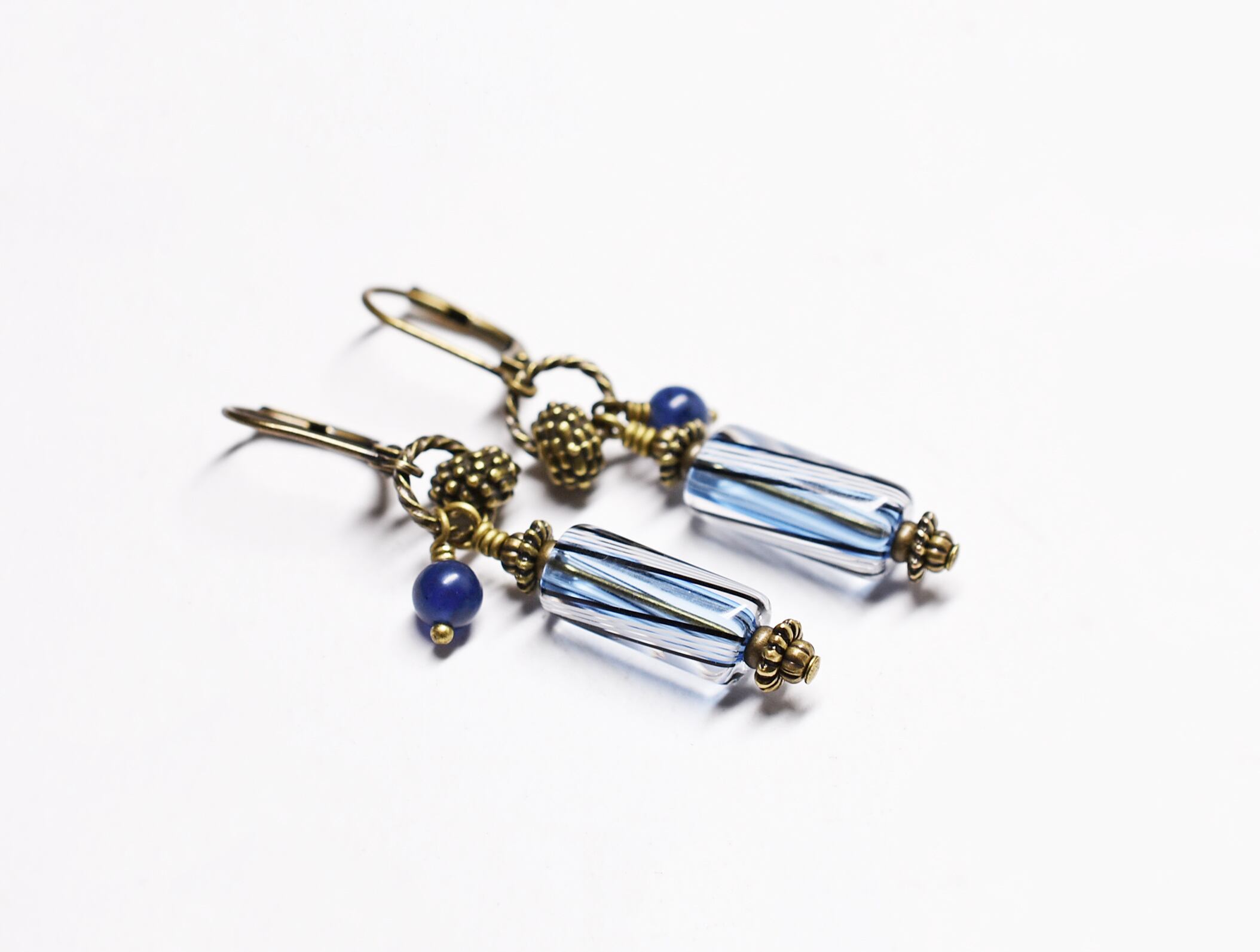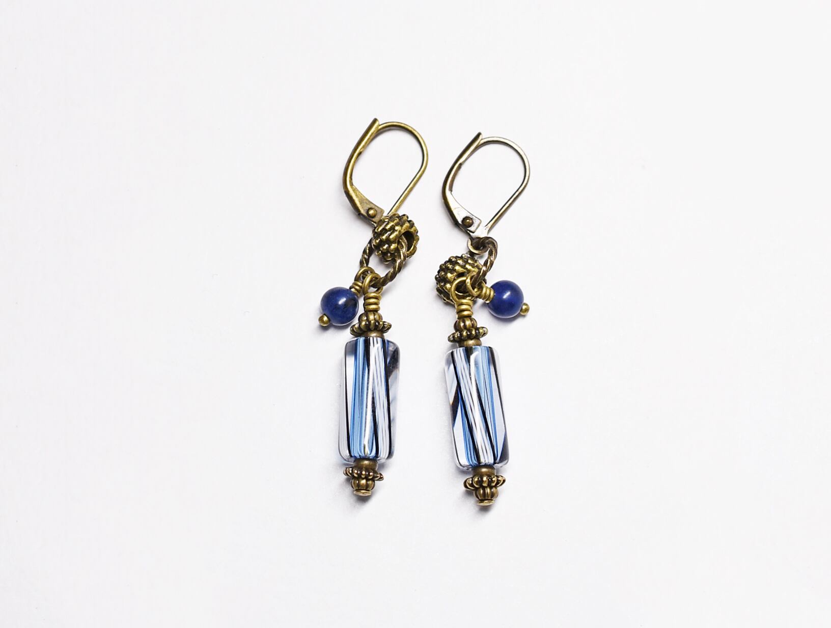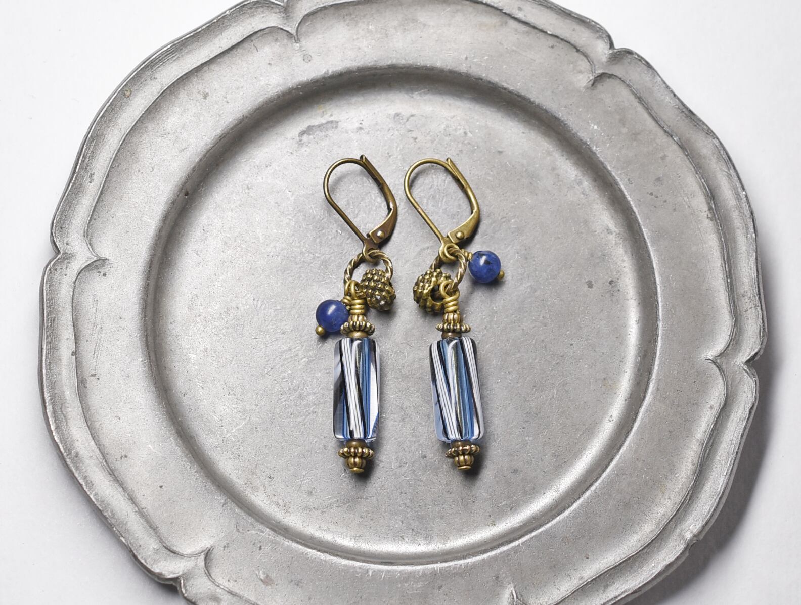 アメリカストライプビーズとソーダライト、松ぼっくりブラスのリングピアス
