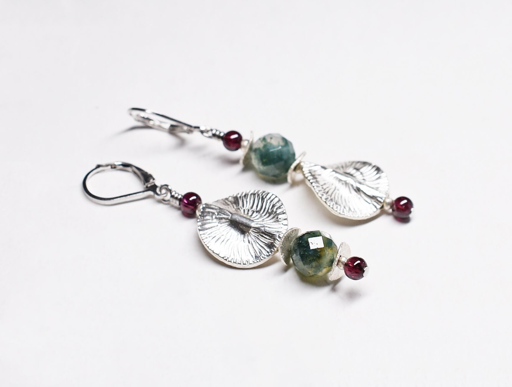 波打つカレンシルバーとインディアンアゲート、ガーネットのアンシメトリーピアス