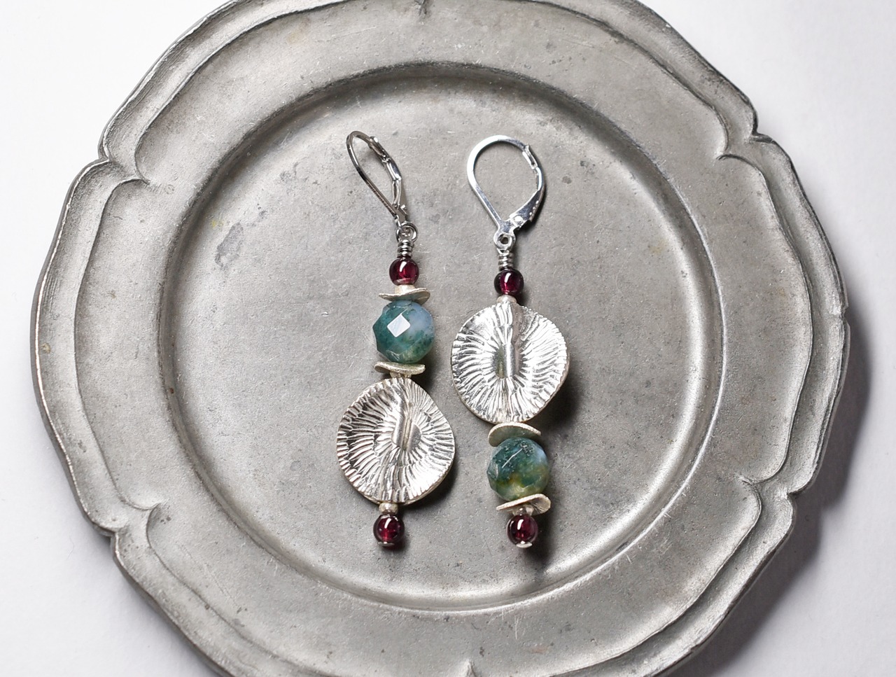 カレンシルバーとインディアンアゲート、ガーネットを繋いだアンシメトリーのピアスです。