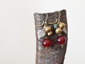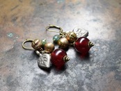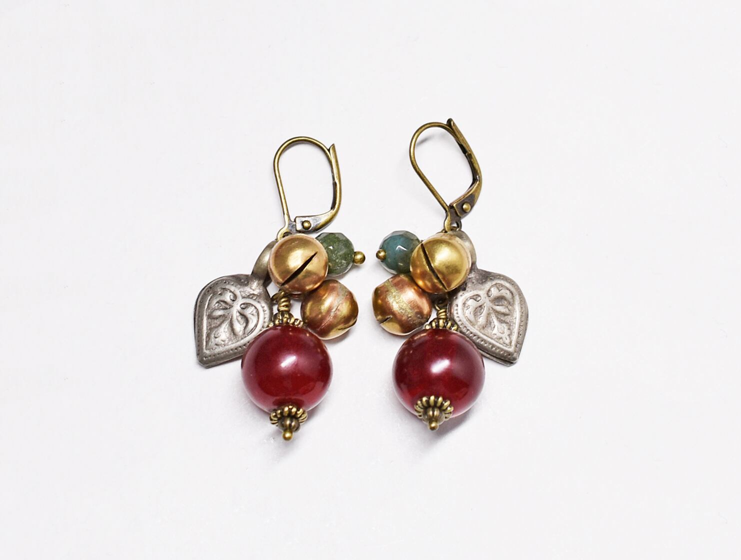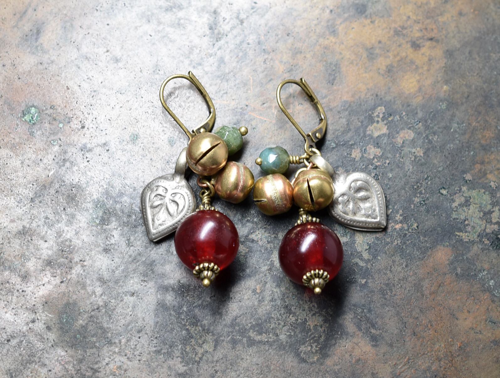 アンティークボヘミア紅玉ビーズとインディアンアゲート、鈴、ハートモチーフのピアス