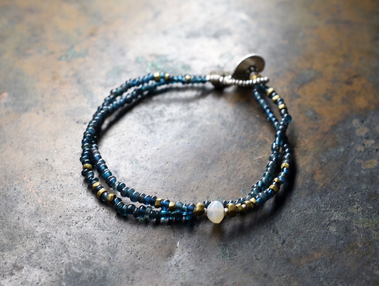 インディゴブルーに渋い金色が凛とした雰囲気のブレスです。