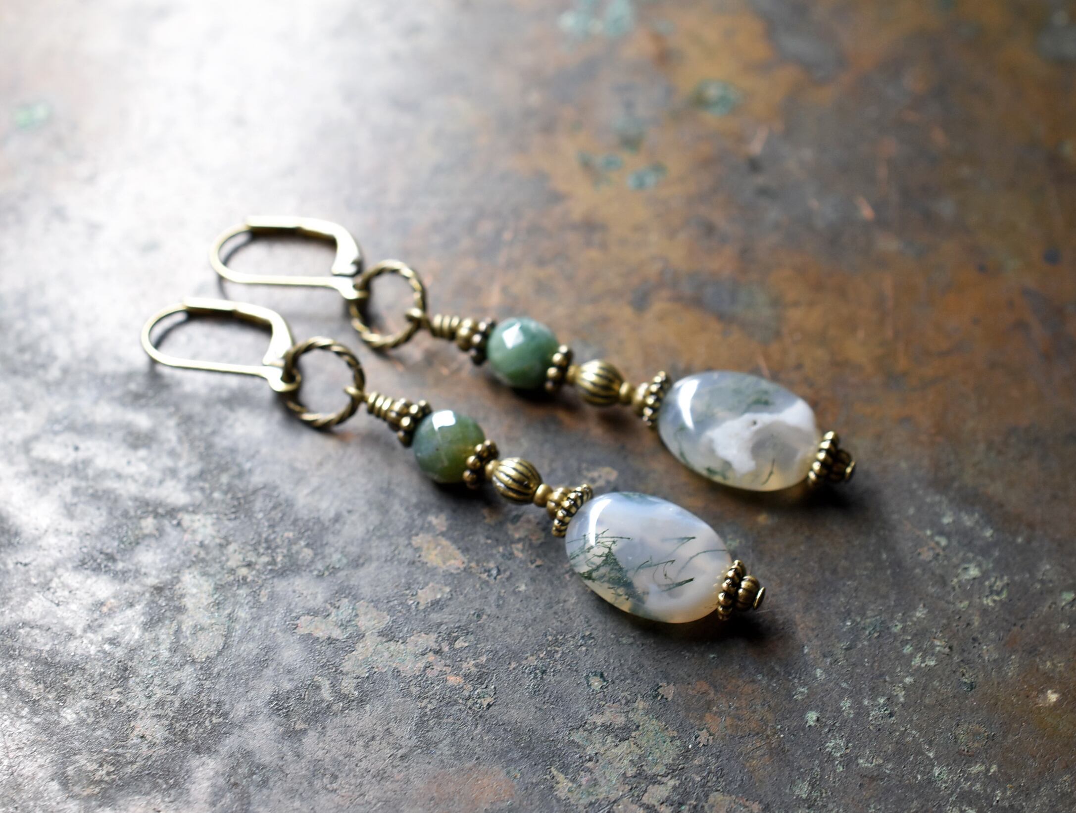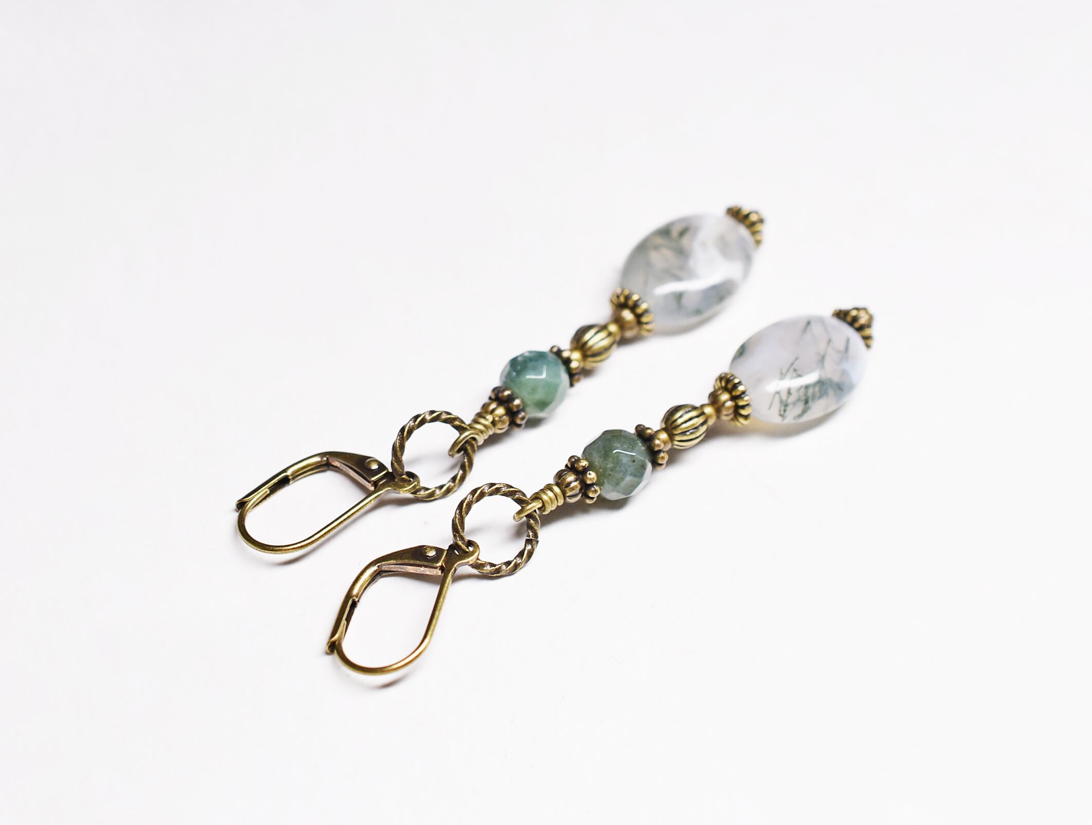 2種類のインディアゲートとブラスビーズを繋いだピアスです。
