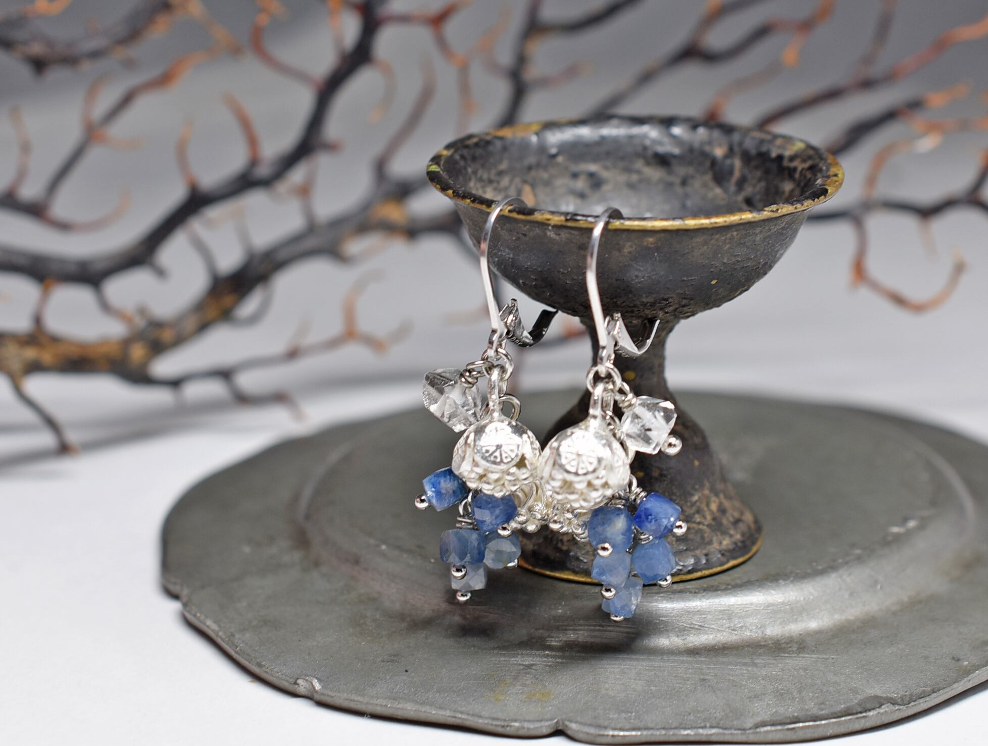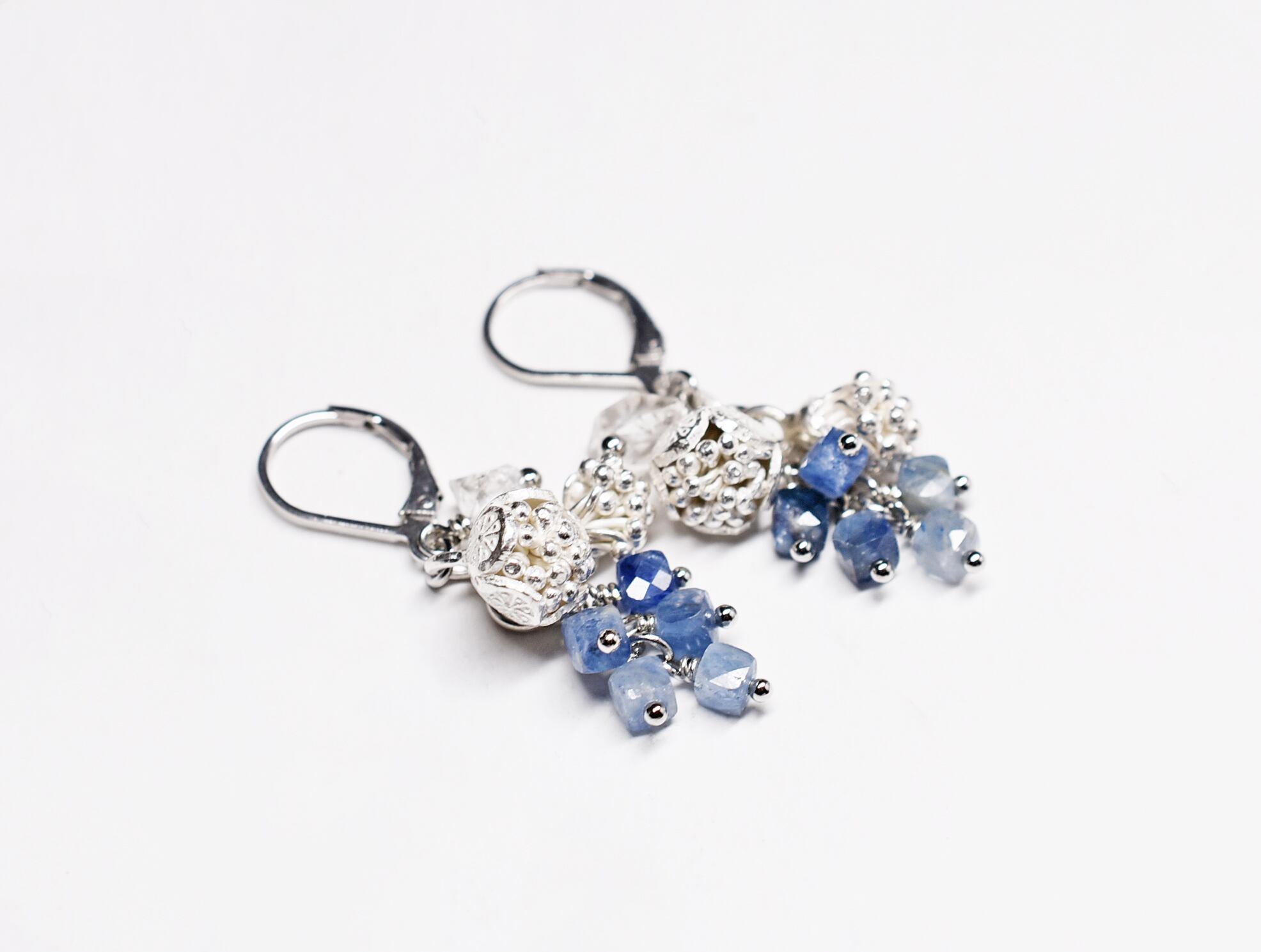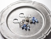 たわわなカイヤナイトとハーキマーダイヤモンド、丸いお花と蕾のカレンシルバーを繋いだピアスです。