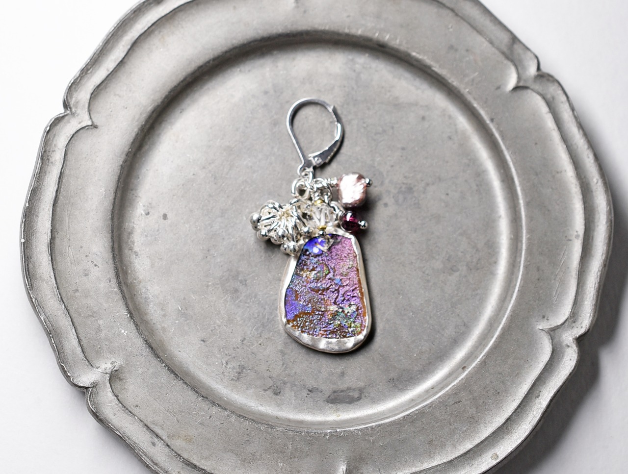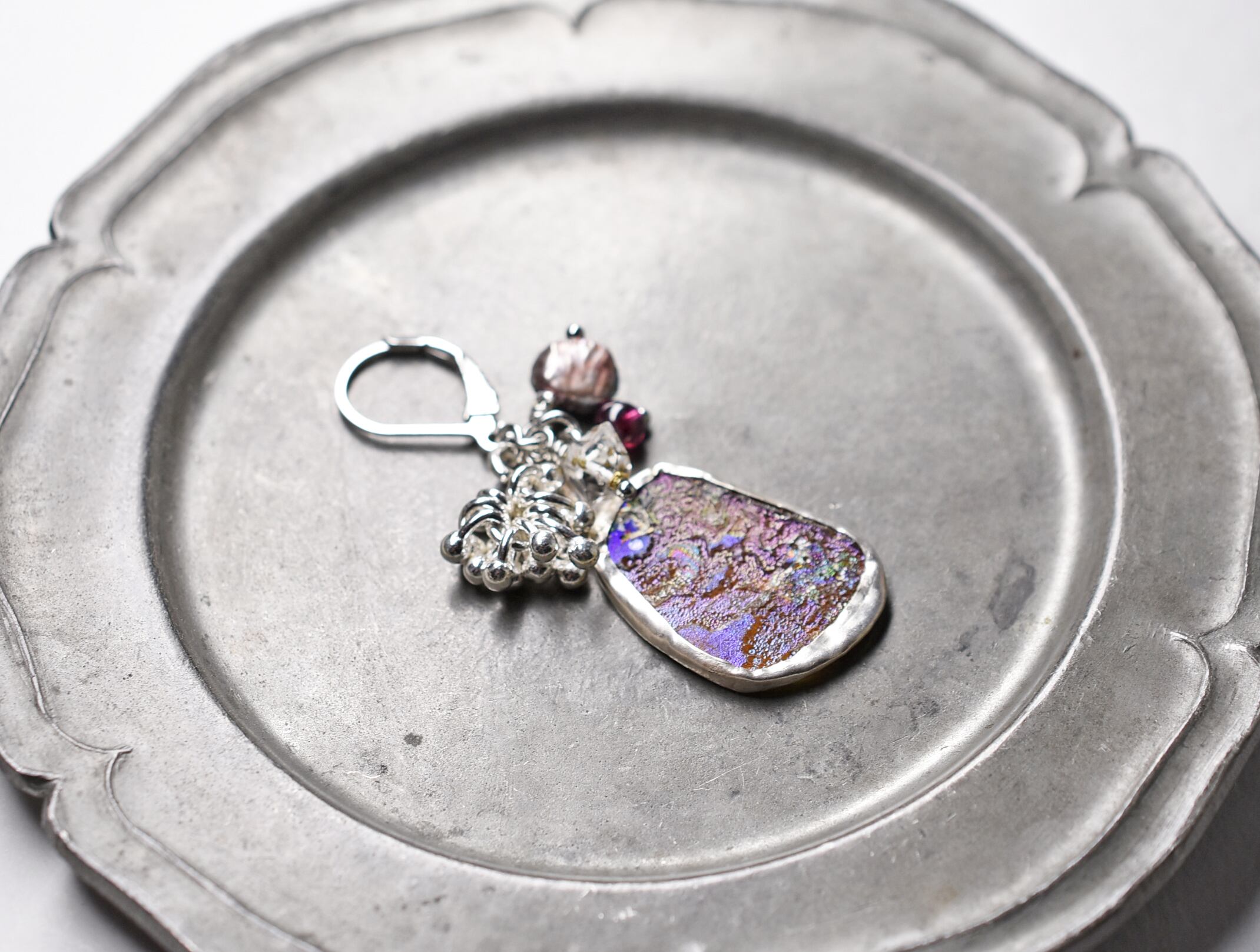 銀化したローマングラスと、カレンシルバーチャーム、ハーキマーダイヤモンド、バロックパール、ガーネットを繋いだアンシメトリーのピアスです。