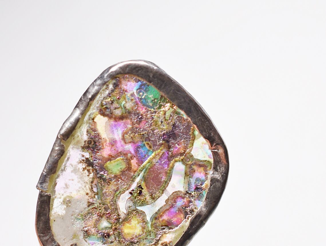 銀化とは、長い年月地中に埋まっていることで、ガラスの成分と土の成分が化学変化を起こしこのようなキラキラとした輝きが生まれます。長く埋まっていたすべてのガラスに銀化が起きるわけではありません。いくつもの条件が重なったもののみにこの現象が現れます。ガラス自体はセミクリアでとっても薄い黄緑色をしています。両面にはまるでオパールのような輝きが見られます。シルバー枠で囲ってあります。