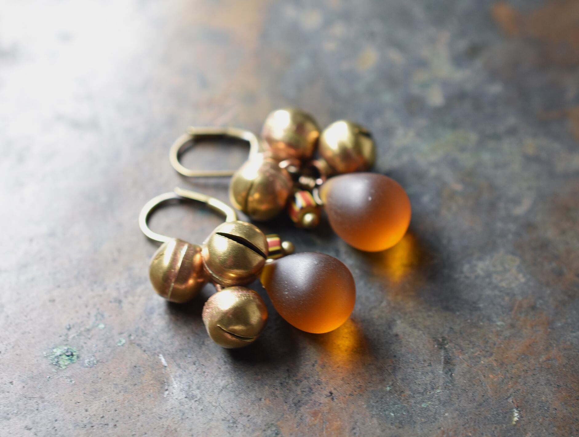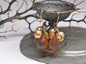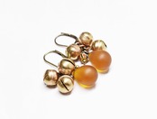 琥珀色ウエディングビーズと鈴、ストライプビーズのピアス